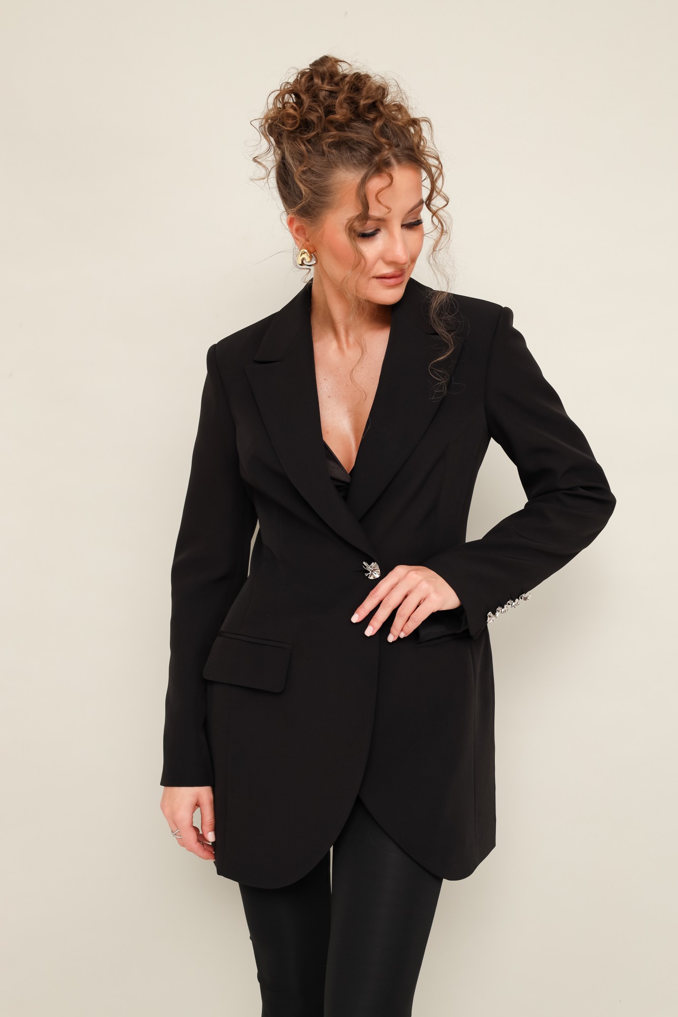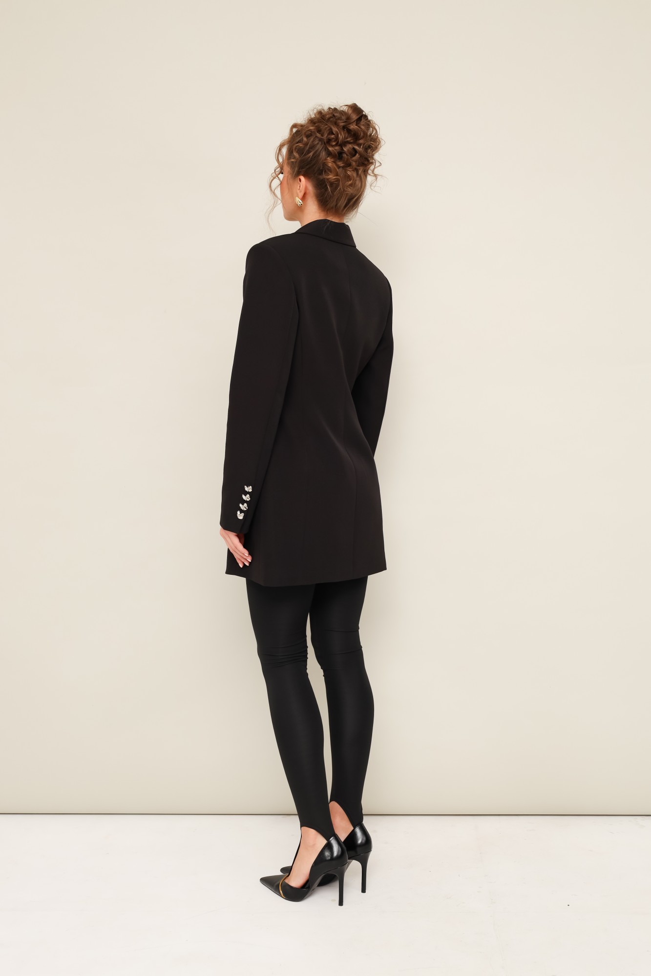 Стильный жакет полуприлегающего силуэта, выполнен из костюмной ткани. Смещенная застежка на петлю и пуговицу. Воротник пиджачного типа с отложными лацканами, край борта скругленный по низу жакета. Спереди обработаны прорезные карманы в рамку с клапанами. Рукава втачные, двухшовные со шлицами с застежкой на петли и пуговицы. Спинка с рельефами и средним швом. Жакет на подкладке. В комплекте прилагаются леггинсы со штрипками.