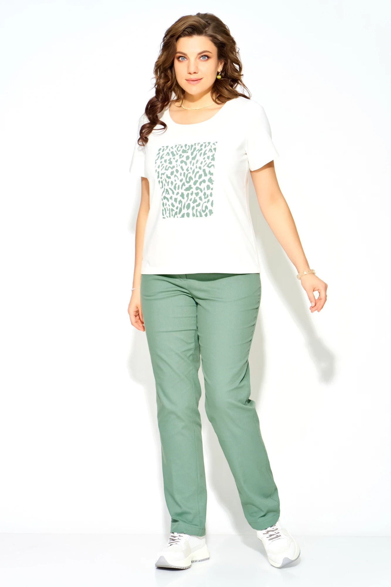 Джемпер — это голос комплекта, его эмоциональный центр. Прилегающий силуэт мягко очерчивает фигуру, а вытачка по груди — как легкий штрих скульптора. Горловина, обработанная планкой, завершает образ сдержанно и элегантно. Но главное — печать «Леопард» на полочке. Это не просто принт, это вызов, энергия, дикая грация, которая прячется под спокойной поверхностью.
