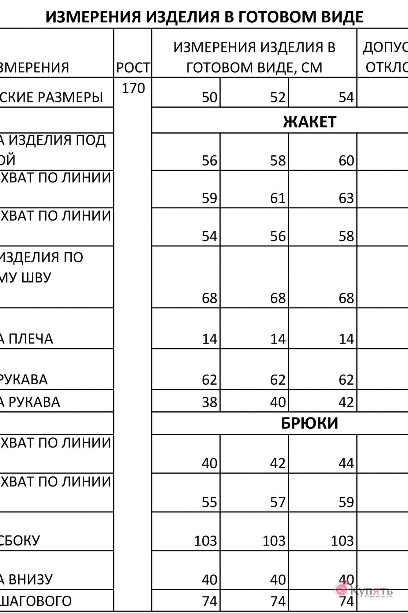 Таблица размеров