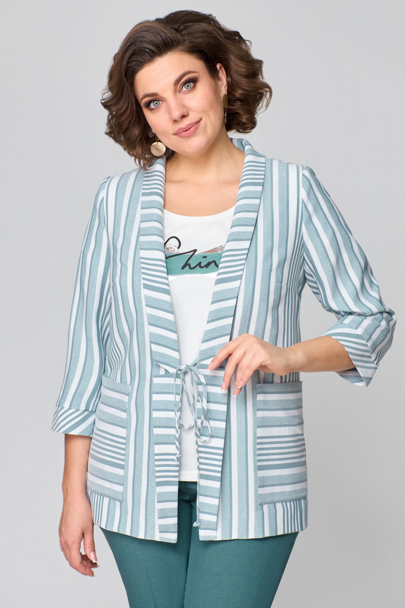 Жакет – полиэстер 44%, вискоза 39%, лен 17%. Топ – хлопок 94%, лайкра 6%. Брюки – полиэстер 44%, вискоза 39%, лен 17%