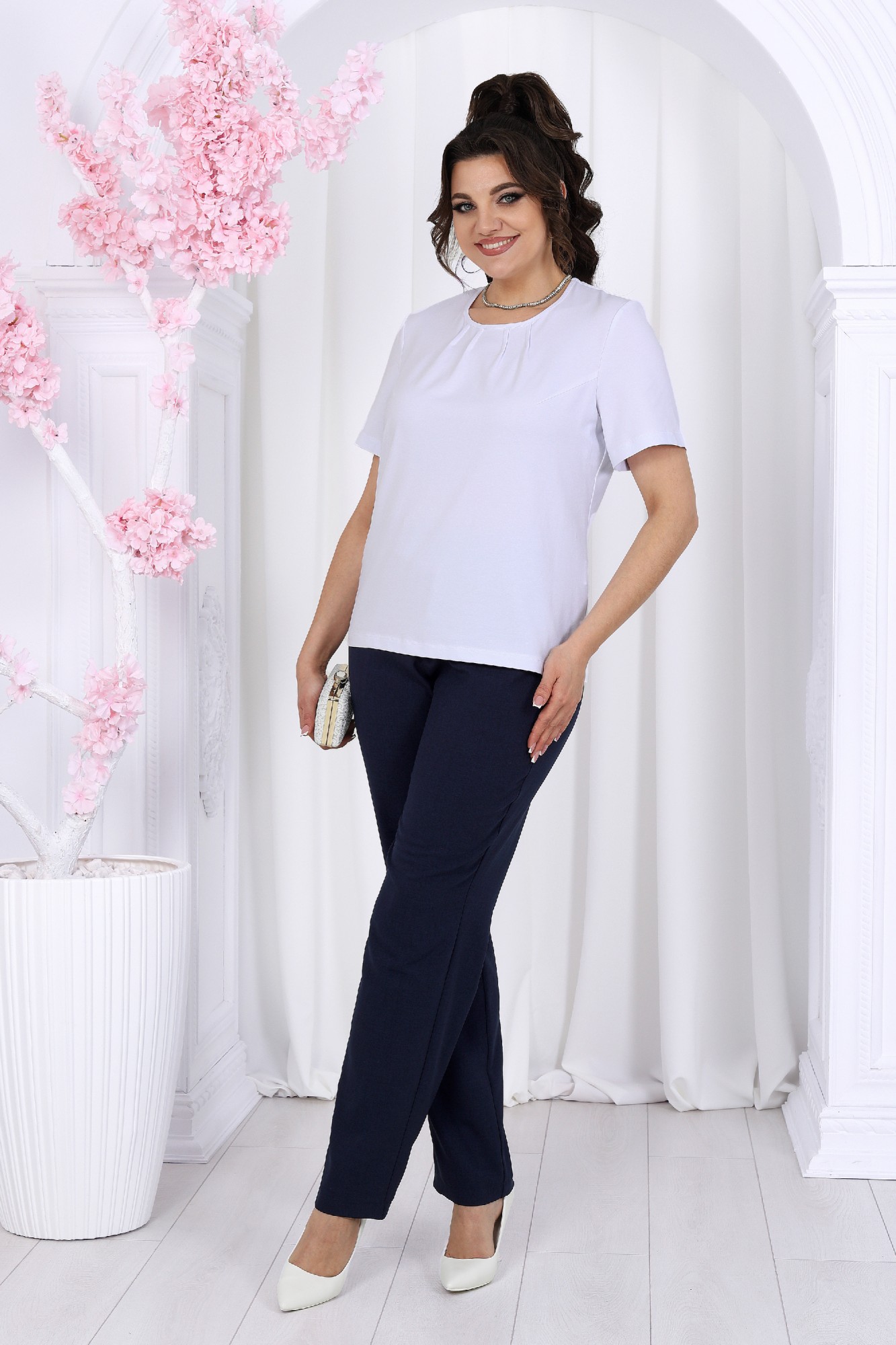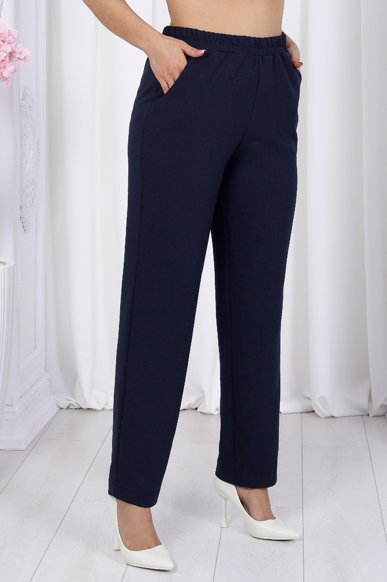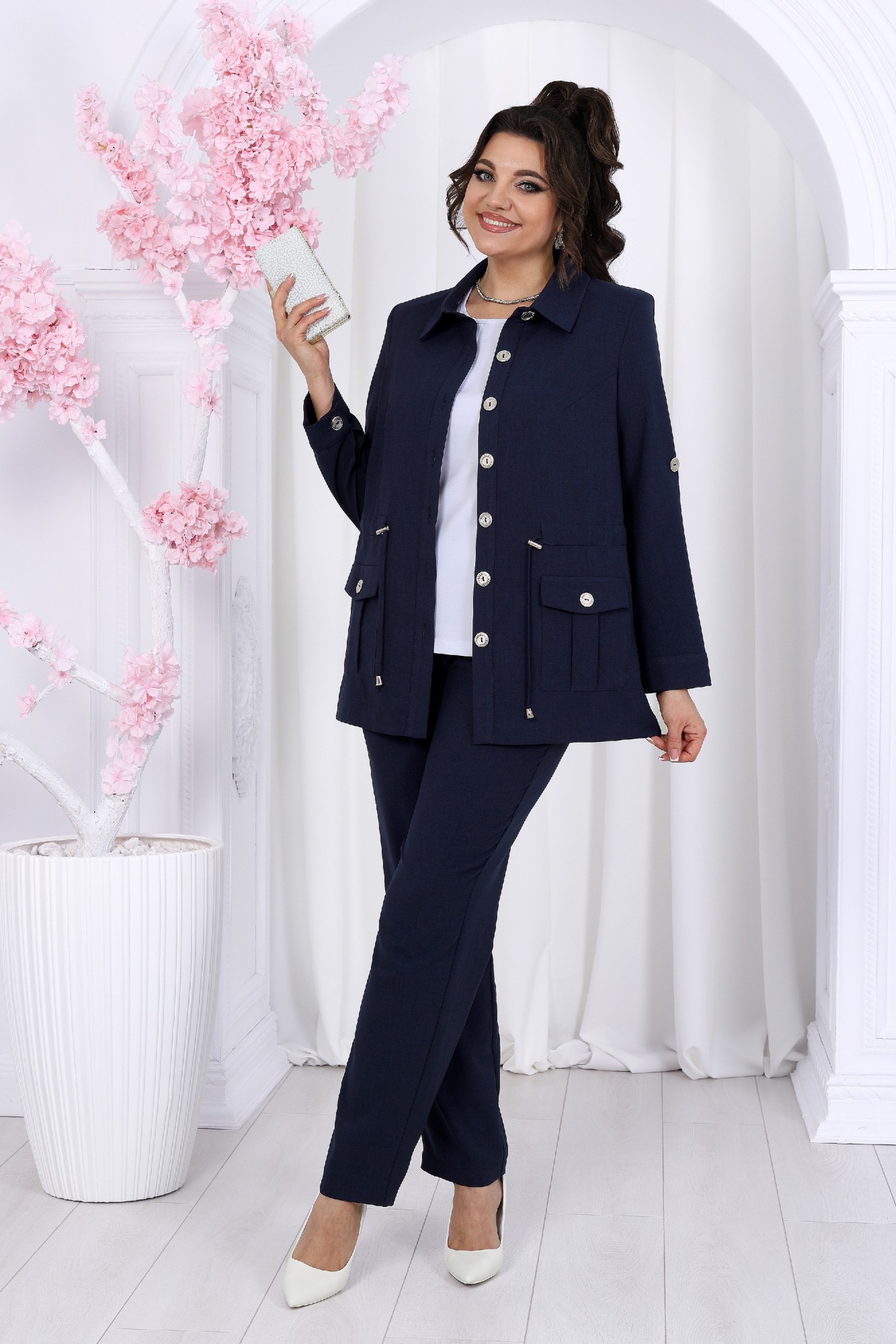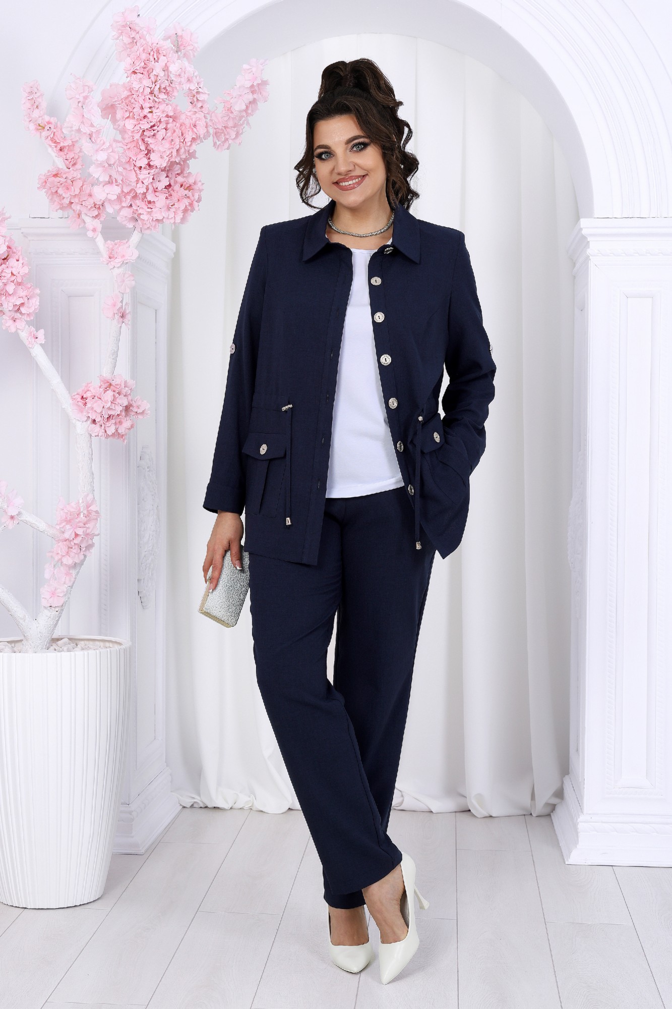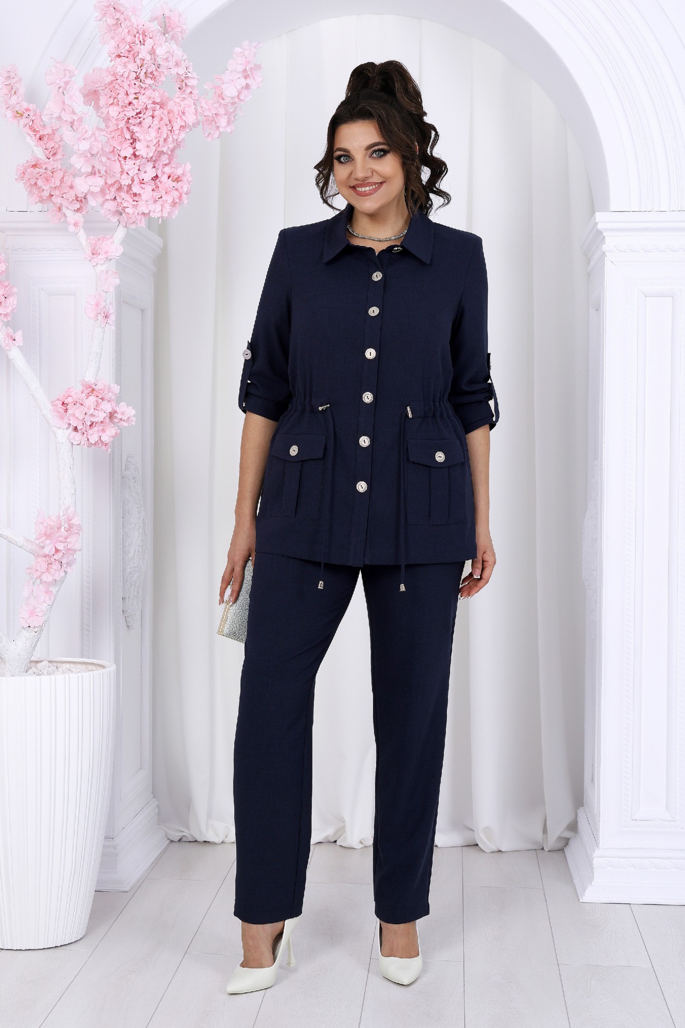 Этот костюм - идеальное сочетание стиля, комфорта и практичности. Он подойдет как для деловых встреч, так и для повседневного использования, дополняя ваш образ уверенностью и элегантностью. Если вам нравится изделия из натурального льна, но надоело ходить всегда в мятой одежде, то ткань лен вишер эта ваше находка. Хотя в составе ткани не присутствует лен, она прекрасно дышит и полностью повторяет текстуру натурального льна, а самое главное она практически не мнется. Комплект брючный 3-х предметный, состоящий из жакета, джемпера и брюк. Жакет прямого силуэта, выполнен из ткани «лен-вишер». Модель без подкладки, с плечевыми накладками и однобортной внешней застежкой с отрезными планками на 7 петель и 7 пуговиц. Перед с нагрудными вытачками, выходящими из пройм. В нижней части переда настрочены накладные карманы с бантовой складкой посередине кармана и клапаны, застегивающиеся на 1 петлю и 1 пуговицу. По спинке и частично по переду настрочена кулиса, в которую втянут поясок из основной ткани. Для регулировки сборки по кулисе предусмотрены фиксаторы, концы пояса оформлены наконечниками. Горловина округлой формы со стояче-отложным воротником на отрезной стойке. Рукав втачной, длинный, с притачной манжетой, застегивающейся на 1 петлю и 1 пуговицу; по середине рукава настрочена пата, застегивающаяся на 1 петлю и 1 пуговицу, что позволяет регулировать длину рукава. Длина жакета - 71 см (46-50 р-р), 72 см (52-60 р-р), 73 см (62-66 р-р). Длина рукава (с манжетой) - 61 см. Джемпер полуприлегающего силуэта, выполнен из хлопкового трикотажного полотна. Перед с нагрудными вытачками, выходящими из пройм. От горловины вниз застрочены 4 складки. Горловина переда и спинки округлой формы, по переду углубленная. Срезы горловин окантованы косой бейкой. Рукав втачной, короткий. Длина джемпера -60 см (46-50 р-р), 65 см (52-60 р-р), 67 см (62-66 р-р). Длина рукава – 24,5 см (46-50 р-р), 25,5 см (52-60 р-р), 26,5 (62-66 р-р). Брюки классические длинные, прямого силуэта, с посадкой на талии, выполнены из ткани «лен-вишер». Модель без застёжки, на притачном поясе, с эластичной лентой внутри. Передние половинки брюк с боковыми наклонными карманами. Длина брюк по боковому (с поясом)-103 см (46-54 р-р), 104,5 см (56-60 р-р), 106 см (62-66 р-р).