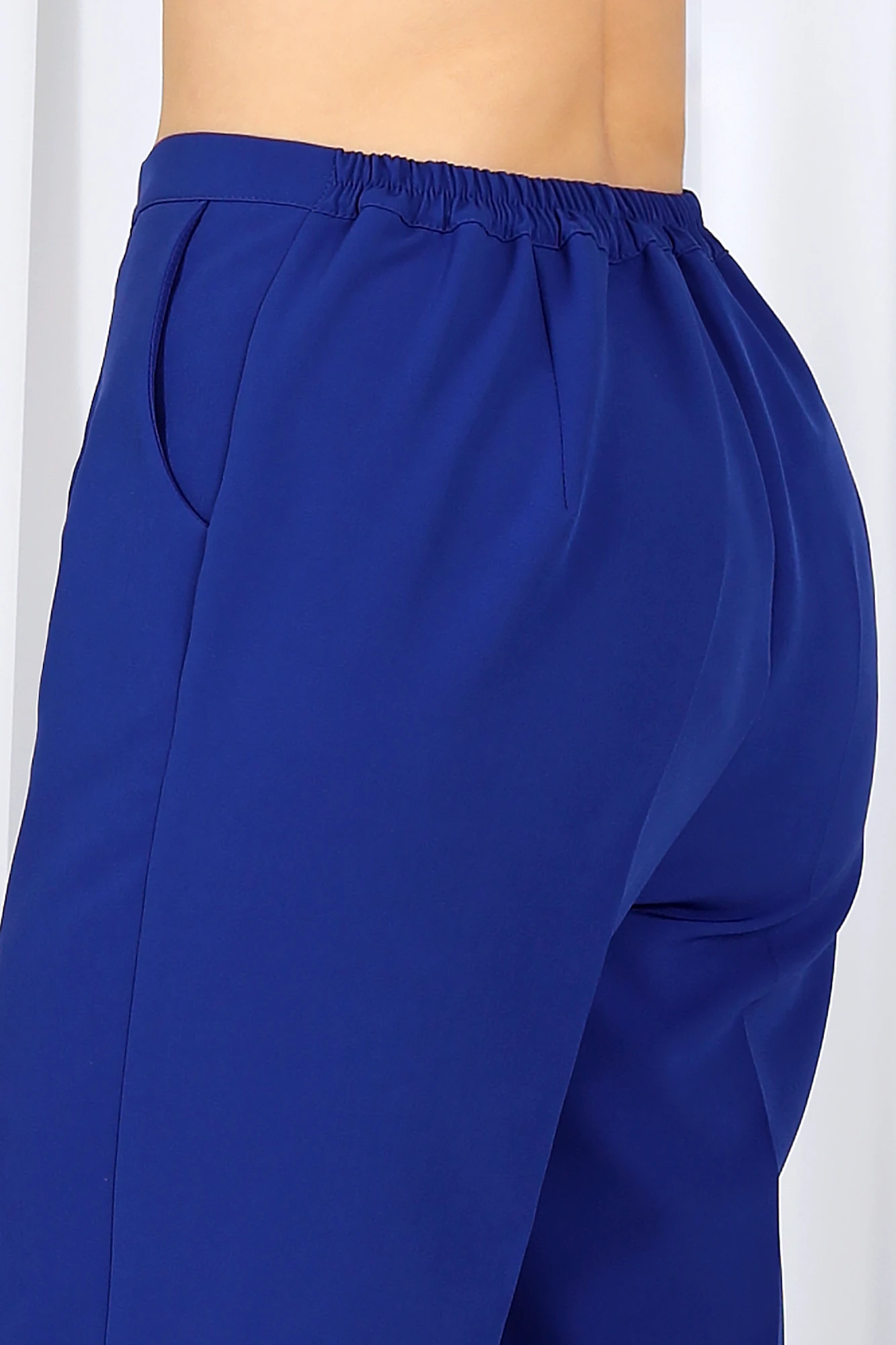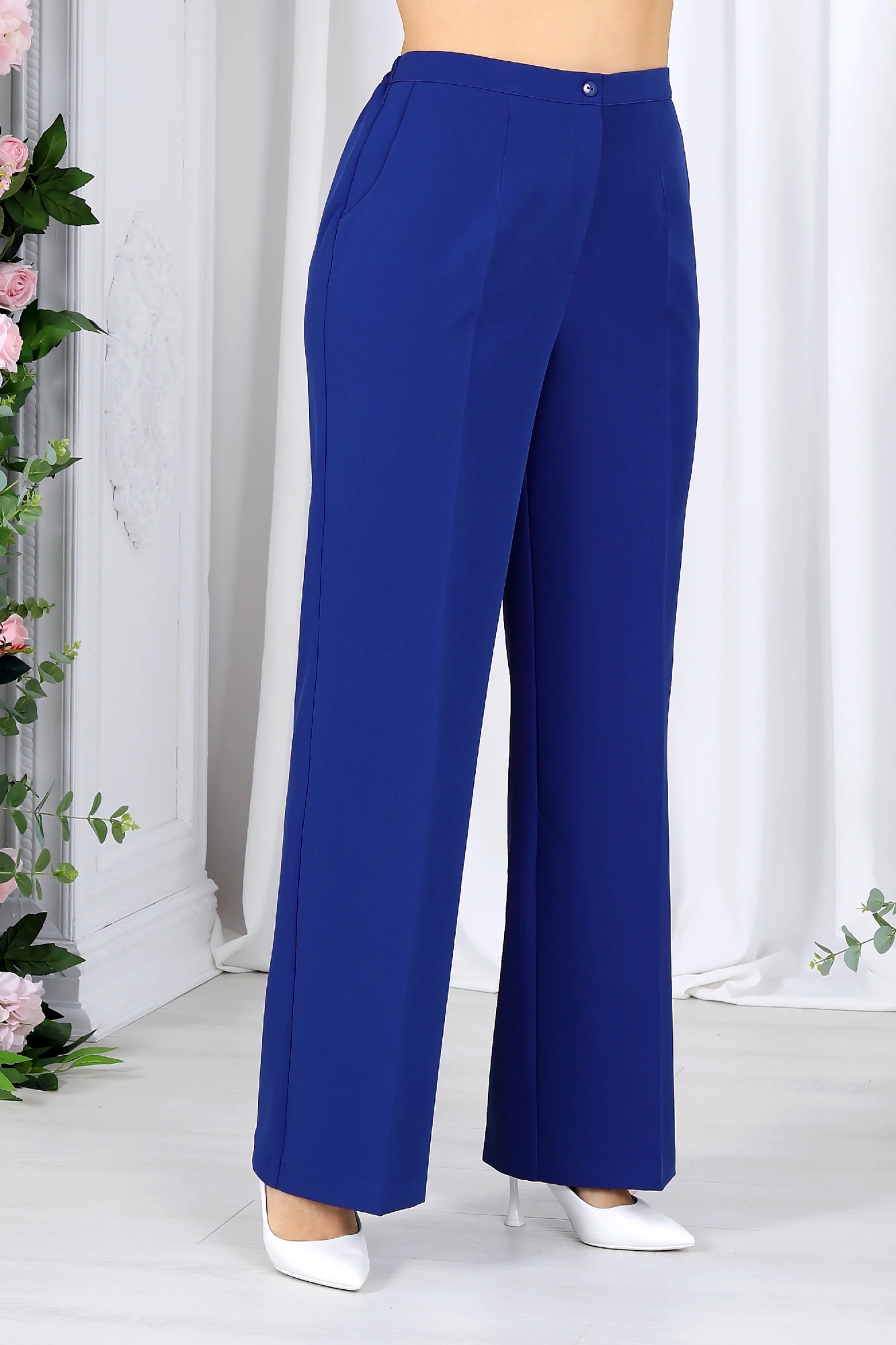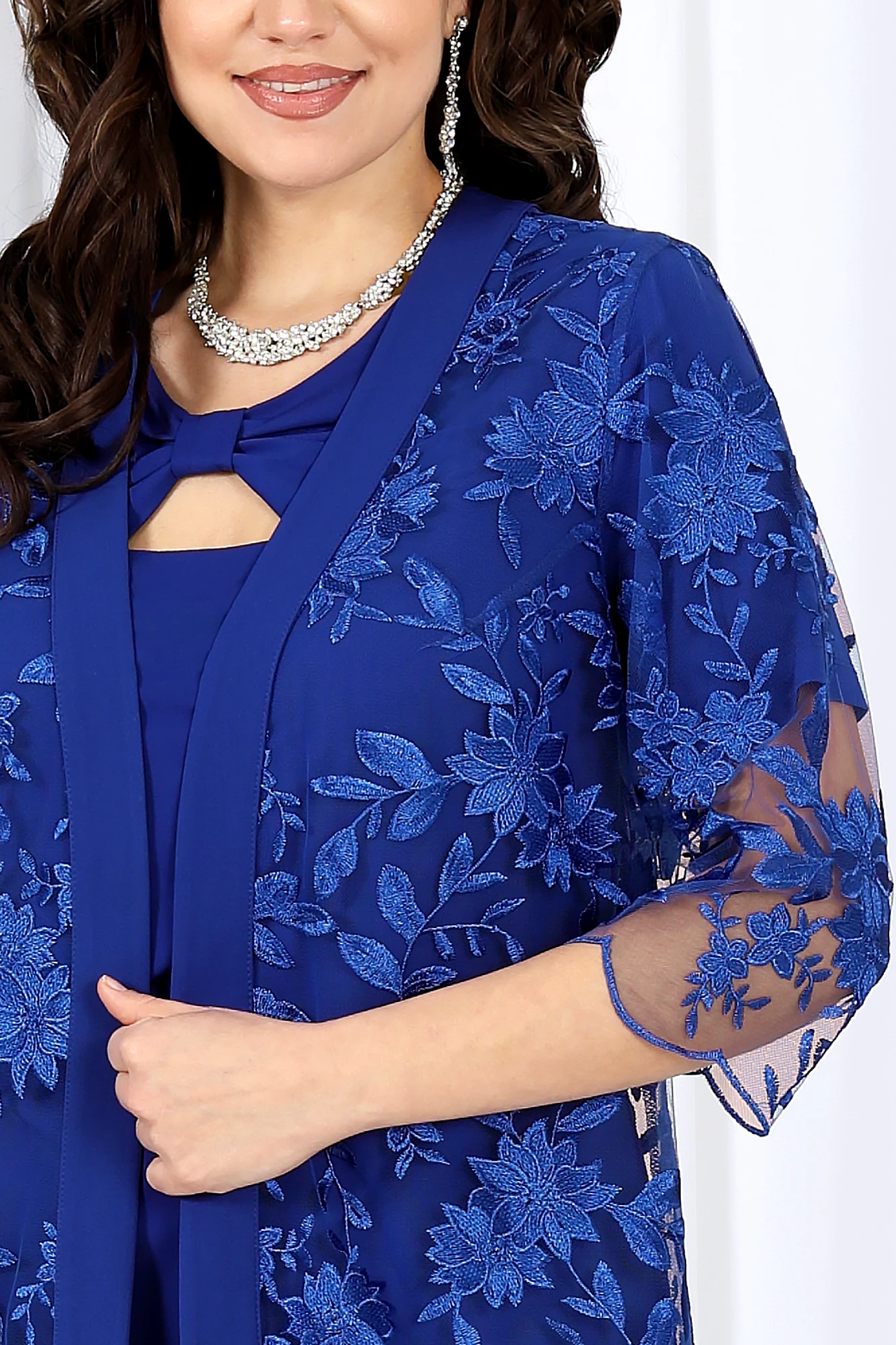 Праздничный женский костюм-тройка — гармоничное сочетание элегантности, комфорта и идеальной посадки для женщин с выразительными формами. Модель создана для тех, кто ценит стиль и практичность: она подходит как для торжеств, так и для деловых мероприятий. Главное украшение комплекта — нарядный гипюровый кардиган с фестонами по краю рукавов. Прозрачная текстура изящно подчеркивает фигуру, а насыщенный цвет добавляет образу свежести и праздничности. Такой костюм универсален: он уместен на свадьбе, юбилее, корпоративе, в театре или на важной встрече. Легко сочетается с классической обувью и аксессуарами. Комплект брючный 3-х предметный, состоящий из кардигана, блузки и брюк. Кардиган прямого силуэта, выполнен из гипюра. Модель без застежки, без подкладки и плечевых накладок. Перед с нагрудными вытачками, направленными от пройм. Горловина спинки и край борта оформлены отрезной планкой из костюмно-плательной ткани. Рукав трехчетвертной, с фестонами по низу. Длина кардигана –73 см; длина рукава – 44 см. Блузка полуприлегающего силуэта, выполнена из трикотажного полотна «масло». Модель без плечевых накладок. Перед с горизонтальным подрезом выше линии груди: нижняя часть -- с нагрудными вытачками, верхняя -- выполнена в виде имитации банта с перемычкой. Рукав короткий, втачной. Длина блузки-57 см; длина рукава 23 см. Брюки классические, длинные, с посадкой на талии, выполнены из костюмно- плательной ткани. Модель со стрелками. Передние и задние половинки брюк с талиевыми вытачками, направленными от пояса вниз. Спереди обработаны наклонные боковые карманы и центральная застёжка на тесьму-«молнию». Притачной пояс застегивается на 1 петлю и 1 пуговицу; для лучшего прилегания по линии талии в притачном поясе предусмотрена эластичная лента, вставленная по спинке. Длина брюк по боковому (с поясом) – 106 см.