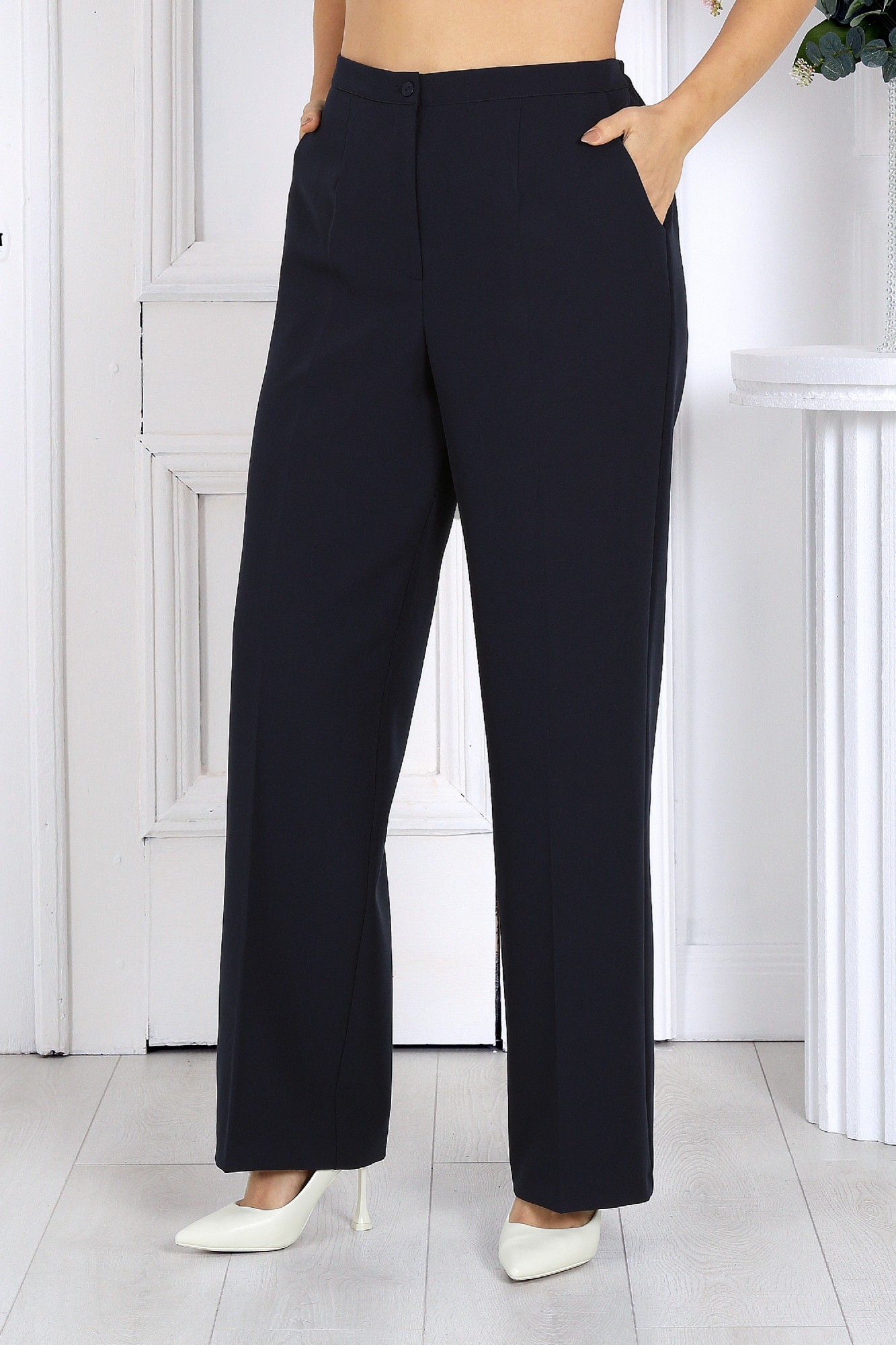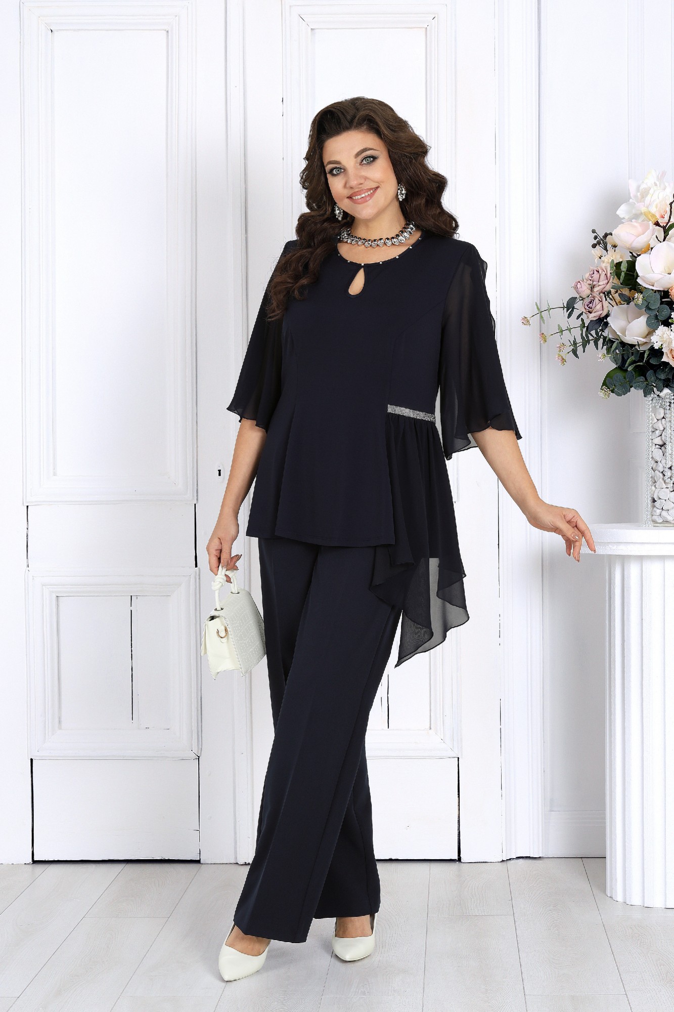 Этот костюм сочетает в себе женственность, комфорт и безупречный крой, подчеркивающий фигуру и скрывающий возможные нюансы. Воздушная блузка выполнена из мягкого трикотажа «масло» и дополнена асимметричной шифоновой деталью, создающей красивый драпирующийся силуэт. Украшение в виде страз и изящный вырез «капля» добавляют образу благородного блеска и утонченности. Легкий рукав формы «крылышко» дарит ощущение свободы и легкости движений. Классические брюки со стрелками идеально садятся по фигуре благодаря эластичной вставке в поясе и мягкой посадке на талии. Этот костюм отлично подходит для женщин с пышными формами — подчеркивает достоинства, визуально вытягивает силуэт и делает образ торжественным и уверенным. Идеален для новогодних праздников, юбилеев, вечеринок и торжеств. Комфортный и нарядный — он станет вашей любимой праздничной двойкой! Комплект брючный 2-х предметный, состоящий из блузки и брюк. Блузка полуприлегающего силуэта, выполнена из трикотажного полотна «масло». Модель без воротника и застежки. На переде и спинке обработаны рельефные швы, направленные от проймы до низа. На левой боковой части переда – горизонтальный подрез с отлетной деталью из шифона. Шов подреза декорирован тесьмой со стразами. Горловина круглой формы, окантована косой бейкой из основного полотна; спереди декорирована стразами и дополнена вырезом «капля». Рукав короткий, формы «крылышко на запах», со скругленными срезами; выполнен из шифона. Брюки классические, длинные, с посадкой на талии, выполнены из костюмно- плательной ткани. Модель со стрелками. Передние и задние половинки брюк с таллиевыми вытачками, направленными от пояса вниз. Спереди обработаны наклонные боковые карманы и центральная застёжка на тесьму-«молнию». Притачной пояс застегивается на 1 петлю и 1 пуговицу; для лучшего прилегания по линии талии в притачном поясе предусмотрена эластичная лента, вставленная по спинке.
