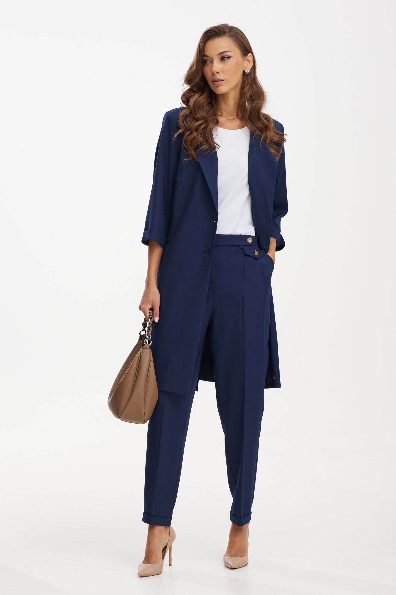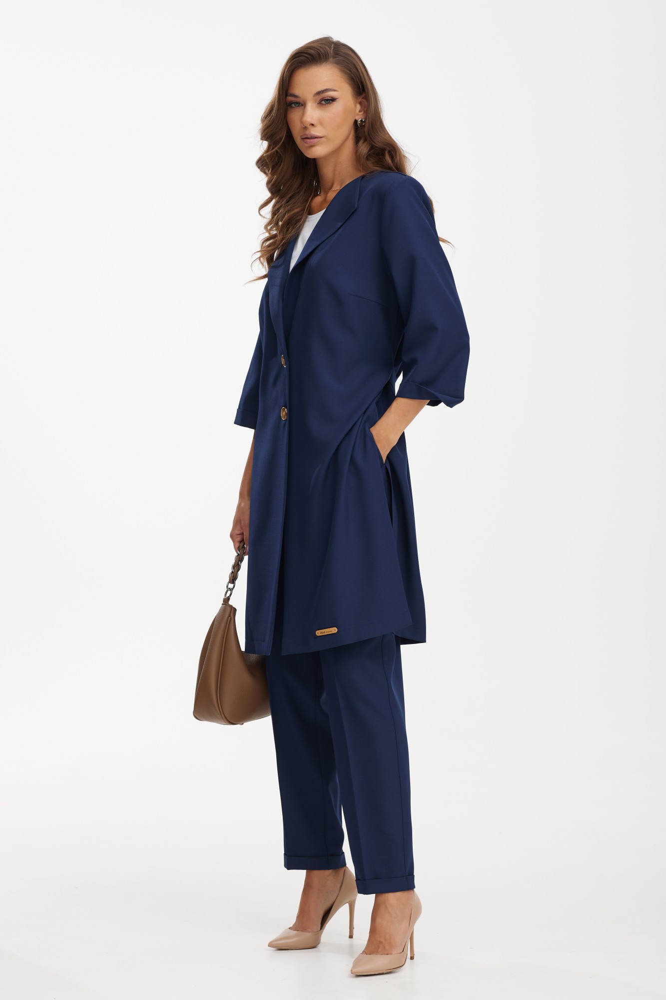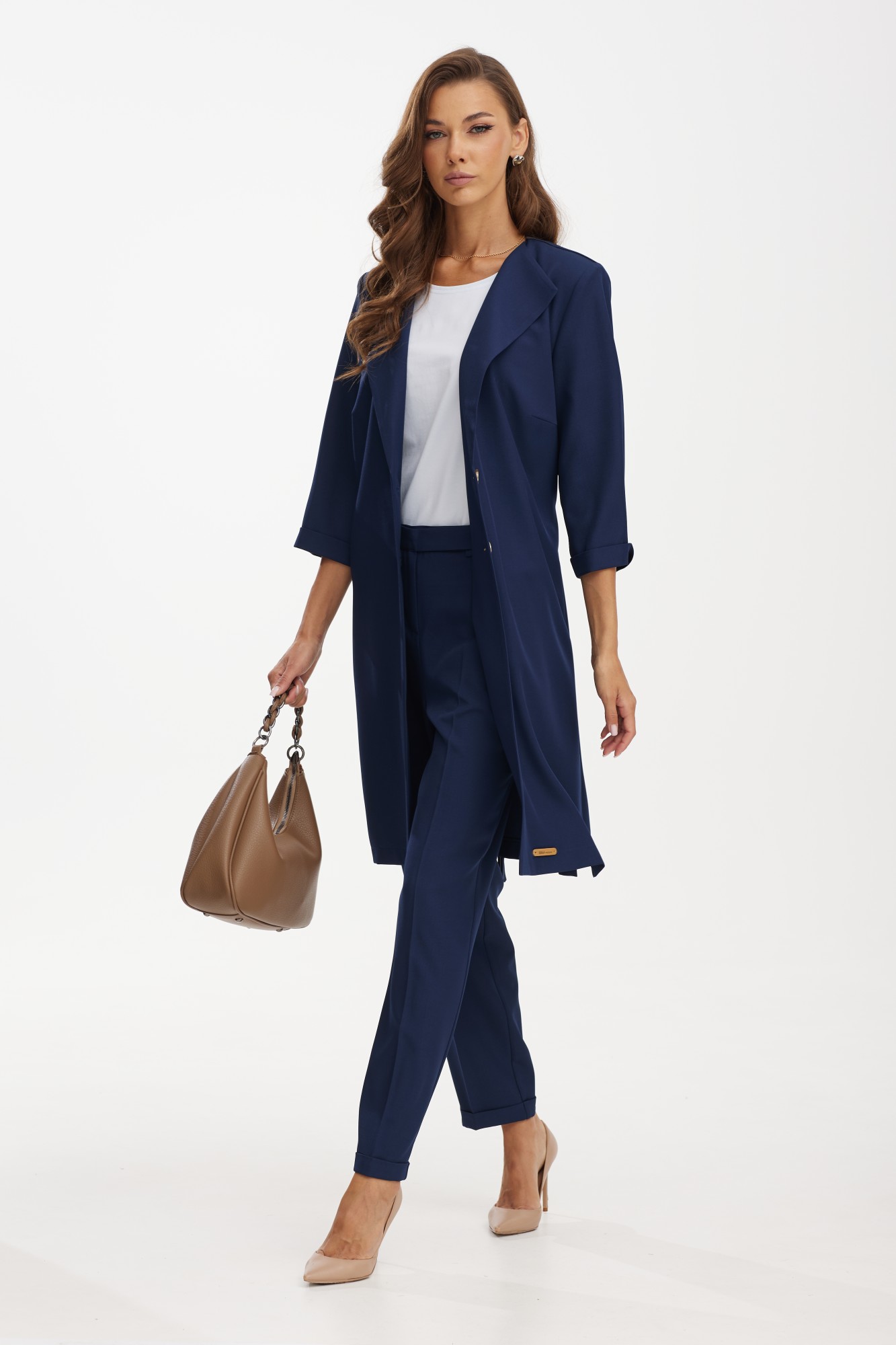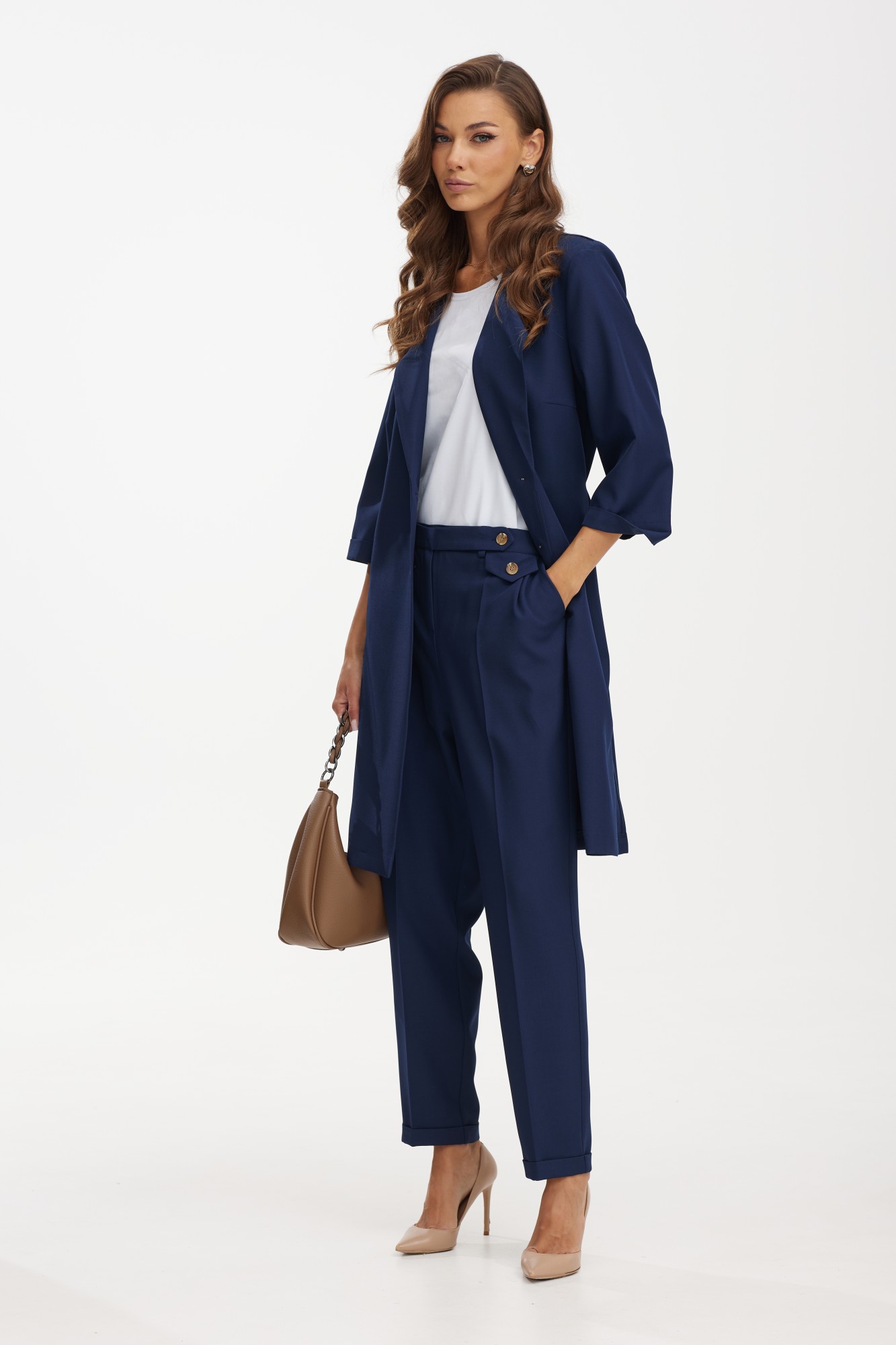 Костюм с удлиненным жакетом от белорусского бренда Твой Имидж – это изящное и элегантное решение для стильных и современных женщин. Элегантный женский костюм от белорусского производителя состоит из удлиненного жакета, брюк и блузки. Качественная ткань лен вишер, из которой выполнена модель, обеспечит долговечность изделию и приятные ощущения его обладательнице. Блузка выполнена из хлопкового трикотажного полотна. Жакет без подкладки прямого силуэта с намеком на полуприлегание, с центральной бортовой застежкой на две петли-пуговицы, длиной ниже колена. Спинка с отлетной кокеткой и декоративной нашивкой, с таллиевыми вытачками и поясом, который можно завязывать как спереди, так и сзади. По боковым швам расположены разрезы. Рукава втачные, длиной ¾, с манжетой. Удлиненный жакет – это не только модный тренд, но и практичное решение. Он позволяет создать элегантный и стройный силуэт, подчеркивая достоинства фигуры и скрывая недостатки. Благодаря своей длине, такой костюм придает дополнительную изящность и шик образу. Брюки классической формы, зауженные к низу, со стрелками по передним и задним половинкам. Перед с декоративным клапаном, на котором пришита пуговица. На задних половинках расположены таллиевые вытачки, в боковых швах – наклонные карманы. Верхний срез брюк обработан поясом фигурной формы с резинкой по боковым швам. По низу брюк — манжеты. Блузка прямого силуэта, с нагрудными вытачками и коротким втачным рукавом. Одним из преимуществ костюма с удлиненным жакетом является его универсальность. Он подойдет как для делового стиля, так и для особых мероприятий или торжественных случаев. Сочетание такого костюма с брюками в едином цветовом решении, либо с контрастной деталью, создает гармоничный и стильный образ. Дополняя его аксессуарами, такими как пояс, шарф, брошь или сумка, можно добавить индивидуальности и неповторимости. Костюм с удлиненным жакетом – отличный выбор для тех, кто стремится выглядеть элегантно и модно. Благодаря своему уникальному дизайну он придает женщине уверенности и шарма. Независимо от того, какое мероприятие предстоит, такой костюм поможет создать неповторимый образ и вызвать восхищение окружающих.