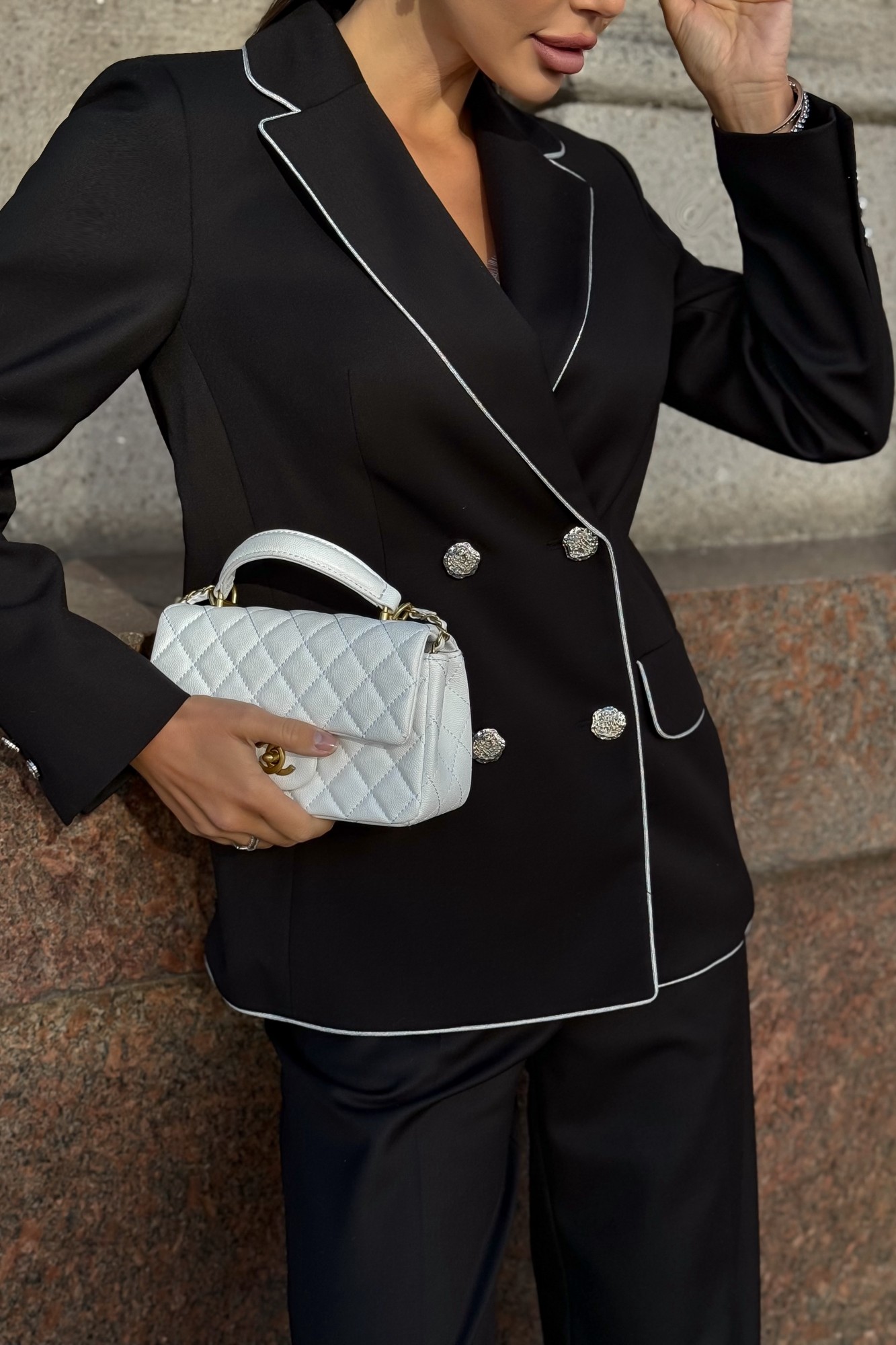 Женский брючный костюм URS — воплощение современного стиля, элегантности и уверенности. Этот черный костюм женский брючный создан для женщин, которые ценят безупречный внешний вид и классику в лучших традициях деловой моды. Элегантный жакет с серебристым кантом и аккуратными декоративными пуговицами придает образу изысканность и подчеркивает статус. Прямые брюки визуально вытягивают силуэт, создавая стройную и женственную линию. Костюм женский 2-х предметный, состоит из жакета и брюк, выполненных из костюмно-плательной ткани, для повседневной носки. Жакет свободного полуприлегающего силуэта, на подкладке, с двубортной застежкой на 2 петли и 4 металлические пуговицы (размер и цвет фурнитуры может незначительно отличаться от фото). Перед и спинка с отрезным бочком. Перед в нижних частях с прорезными карманами с клапаном и обтачкой, с таллиевыми вытачками, с рельефными швами бочка. Клапаны по двум сторонам с отделочным серебристым кантом, концы клапанов слегка закруглены. Спинка со средним швом, с рельефными швами бочка. Рукава втачные, двухшовные, длинные. В локтевом шве по низу с отлетной шпицей с 3-мя петлями и пуговицами. Горловина оформлена воротником пиджачного типа. Концы воротника и лацкана закругленные. Воротник, лацканы, борта, низ переда и спинки обработан отделочным серебристым кантом. Жакет с плечевыми накладками. Брюки женские прямые от бедра, в размерах 46,48 на обтачном поясе, в размерах 50,52,54,56 с притачным поясом, с резинками на уровне боковых швов. По поясам с 5-ю шлевками, с застежкой на тесьму - «молнию», расположенную в среднем шве передних половинок. Пояс застегивается спереди на 1 пришивной потайной крючок, 1 петлю и потайную пуговицу (размер и цвет фурнитуры может незначительно отличаться от фото). Передние половинки брюк с боковыми наклонными карманами. Задние половинки брюк с таллиевыми вытачками, идущих от пояса вниз. Брюки с заутюженными стрелками по передним и задним половинкам.