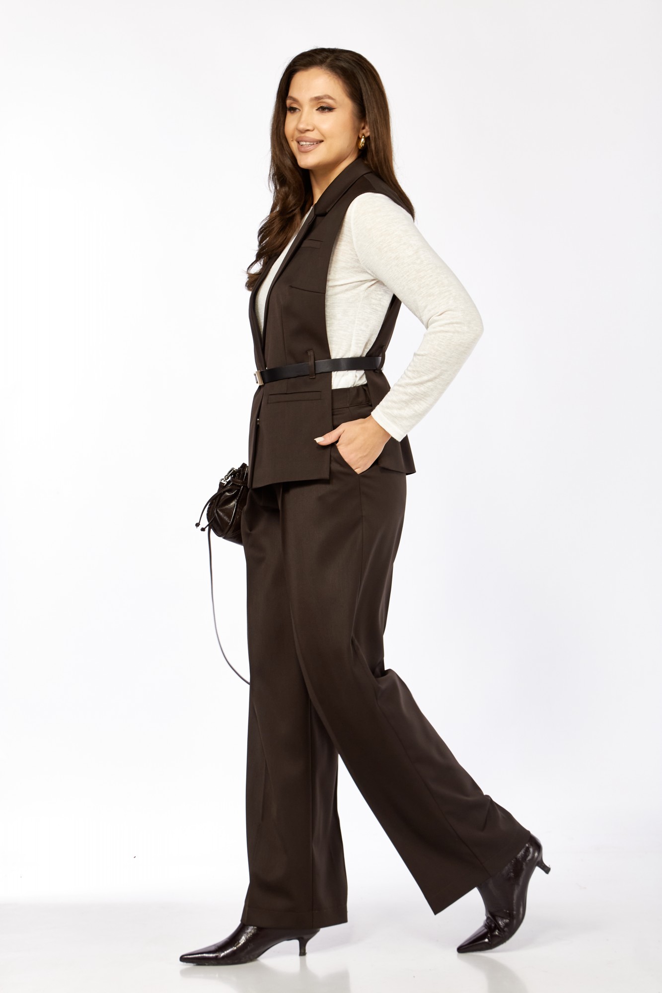 - Жилет: приталенный крой подчёркивает линии силуэта, а V-образный вырез визуально удлиняет шею и делает образ более утончённым. Застёжка на потайные кнопки добавляет аккуратности и минимализма.