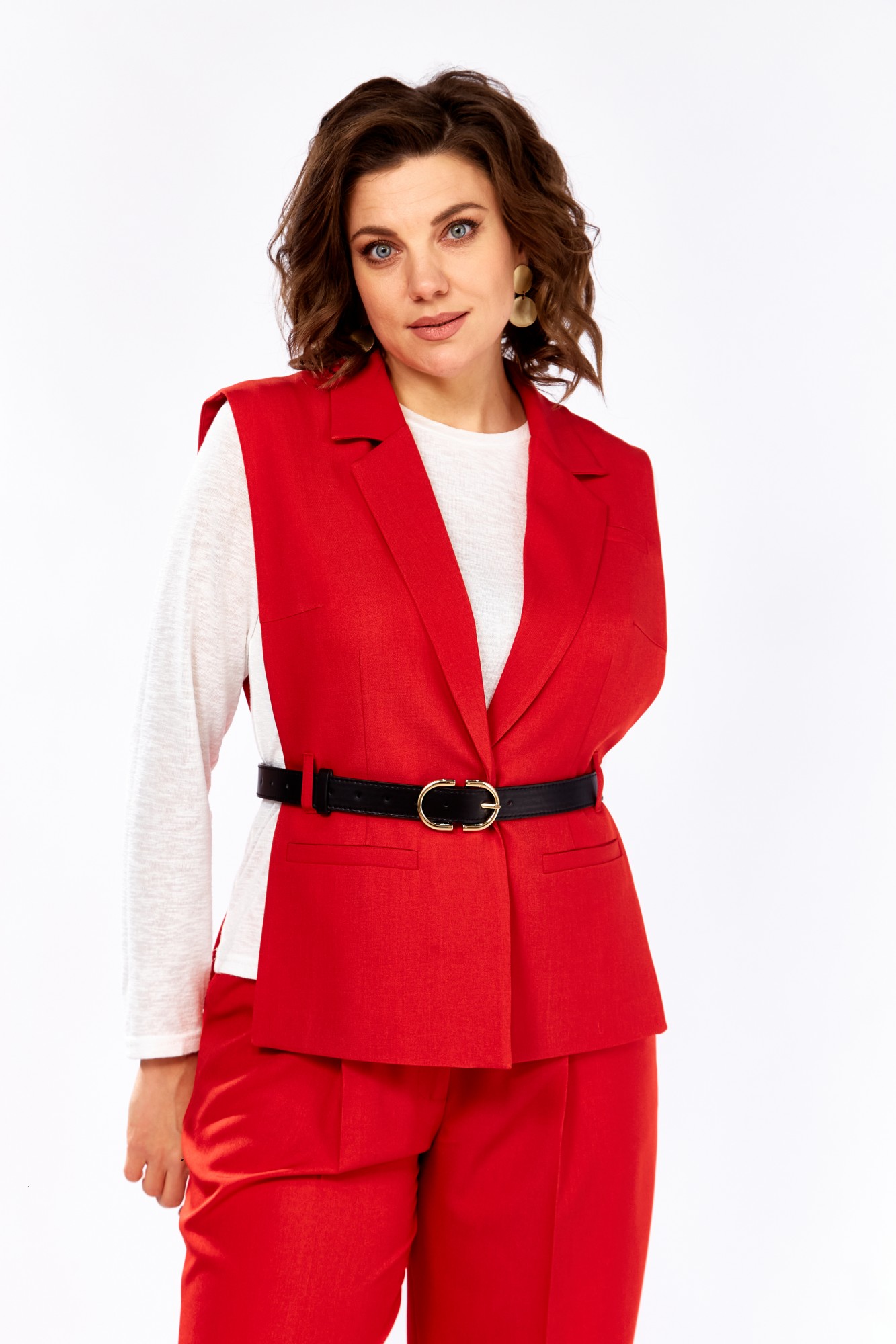 - Жилет: приталенный крой подчёркивает линии силуэта, а V-образный вырез визуально удлиняет шею и делает образ более утончённым. Застёжка на потайные кнопки добавляет аккуратности и минимализма.