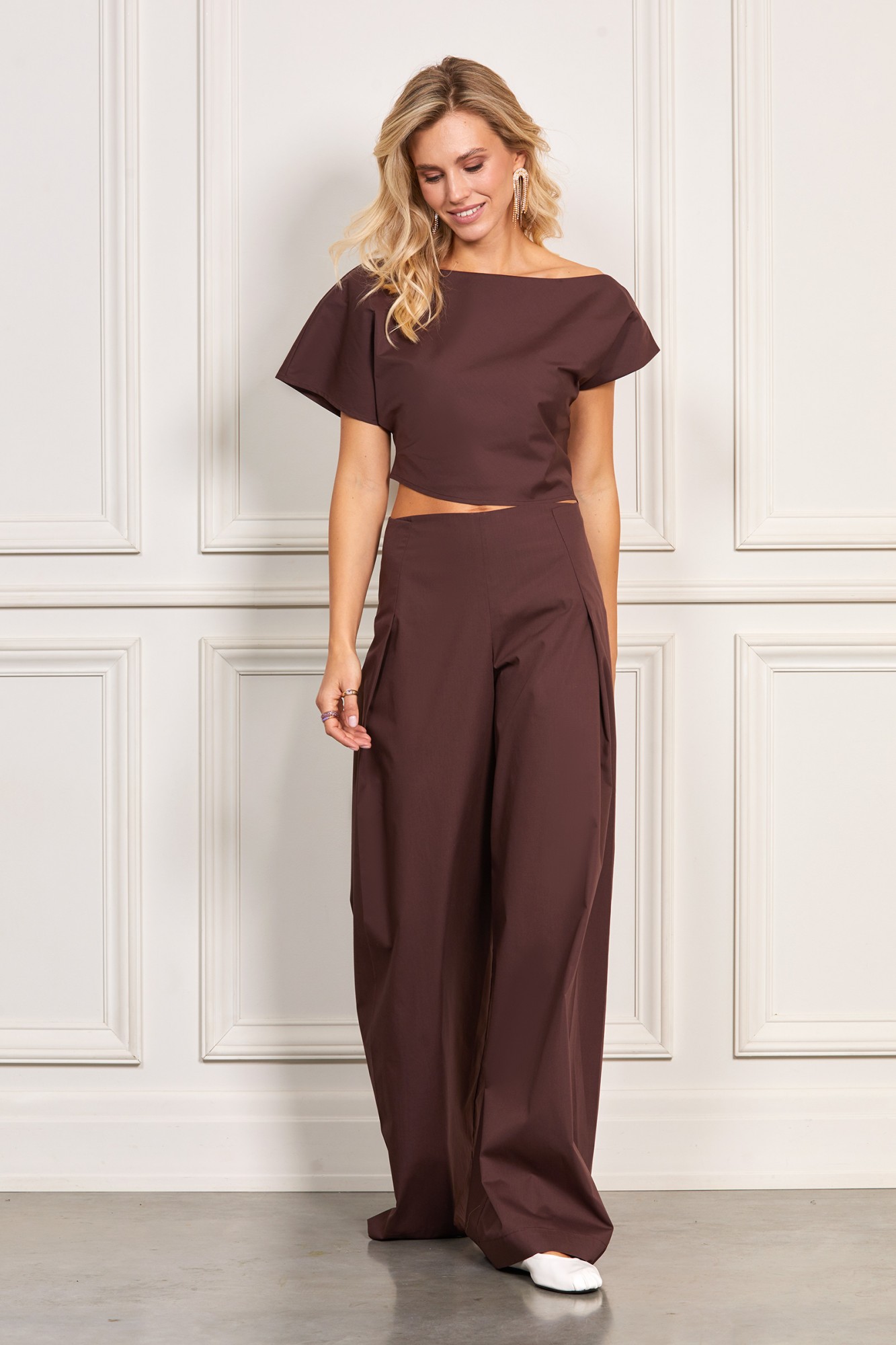 Блуза: - прямой силуэт - горловина ""лодочка"" - линия плеча спущена, асимметричная - в боковом шве потайная молния. Брюки: - расклешенный силуэт - линия талии обработана обтачкой - без боковых швов и карманов - спереди застроченные складки - застёжка на потайную молнию сзади.