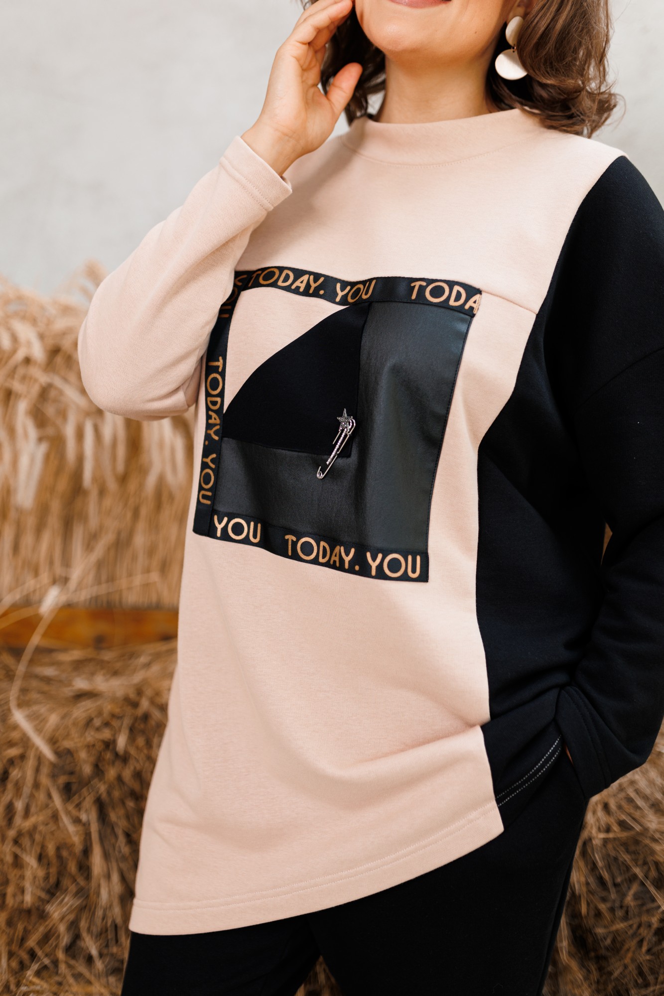 Костюм женский, предназначен для повседневной носки. Костюм женский, 2-х предметный джемпер и брюки. Джемпер женский прямого силуэта с фигурным низом. Перед с отрезной кокеткой с рельефом из отделочной ткани; центральная часть переда декорирована аппликацией и съёмным украшением. Спинка с рельефом из отделочной ткани. Горловина круглая с втачной стойкой. Джемпер со спущенным плечом. Рукав втачной длинный одно шовный. Левый рукав из отделочной ткани. Джемпер без плечевых накладок. Брюки женские длинные, слегка заужены к низу. Передние половинки с карманами в боковых швах. Задние половинки с таллиевыми вытачками. Брюки с притачным поясом, собранным на эластичную тесьму. Длина брюк по боковому срезу 99 см. Длина спинки джемпера 81 см, длина рукава 45 см, длина рукава от горловины 70 см.