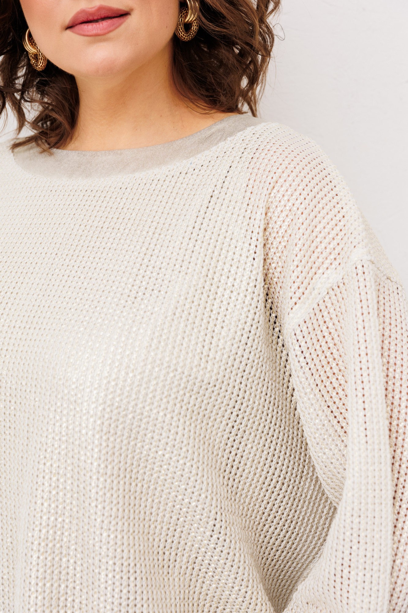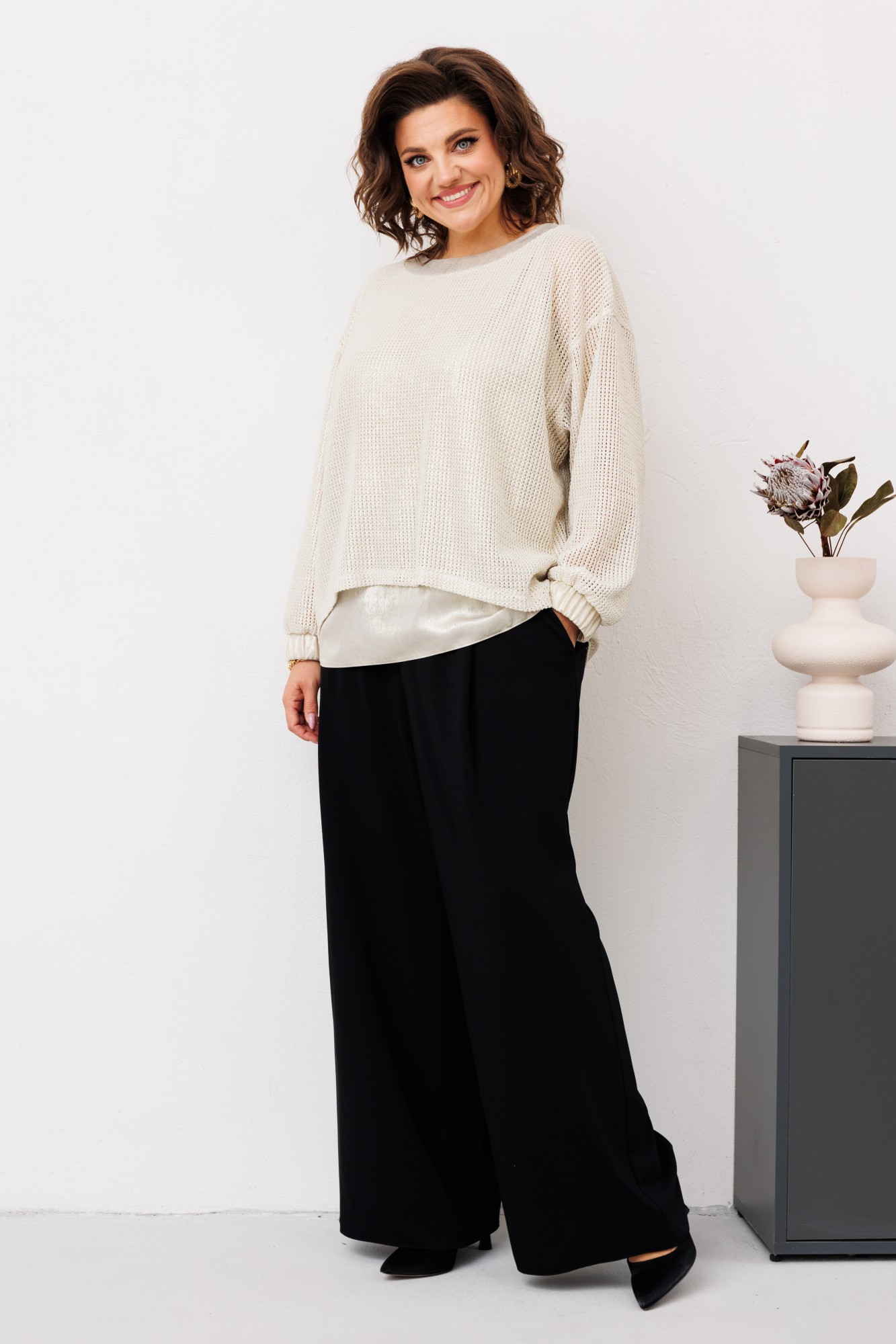 Джемпер: 85% ПЭ, 10% хлопок, 5% спандекс. Топ: 100% ПЭ. Брюки: 85% ПЭ, 15% вискоза.