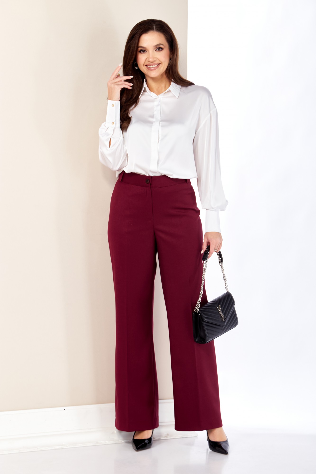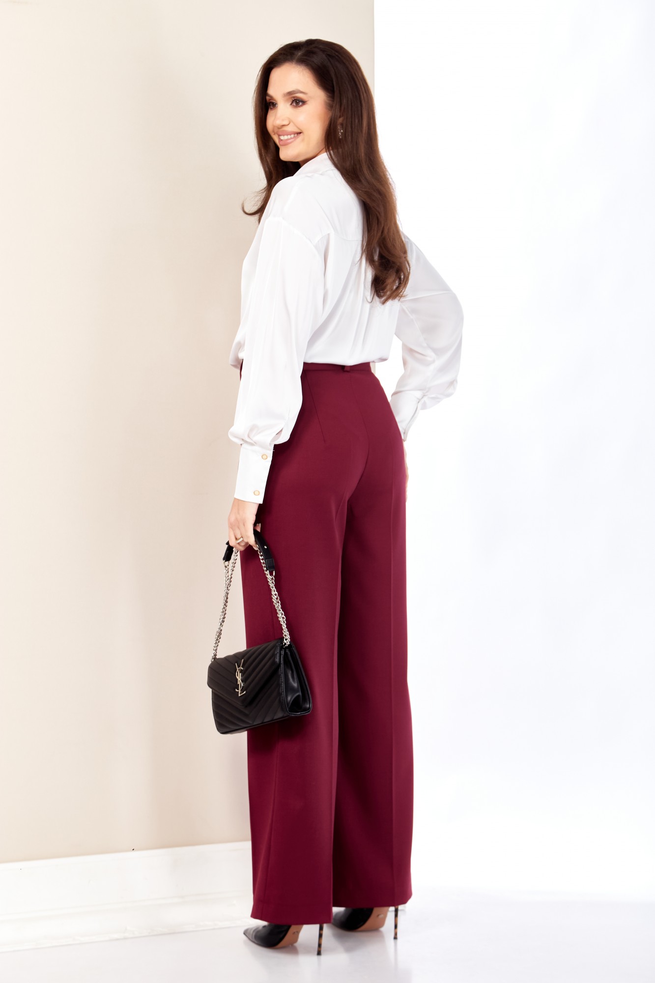 Брюки классического стиля, прямого силуэта, со стрелками в передней и задней части, на притачном поясе со шлевками и застежкой на молнию и пуговицу (высокая посадка). В передней и задней части расположены талиевые вытачки.