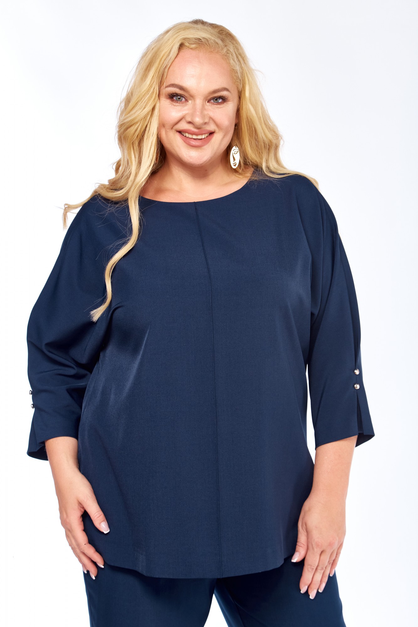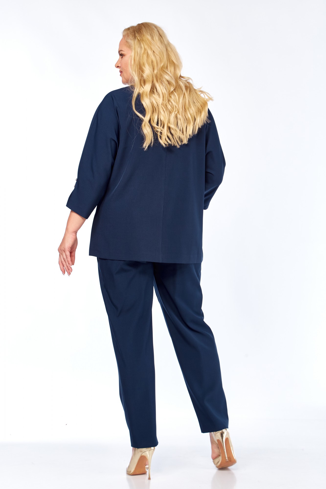 Силуэт полуприлегающий. Рукав цельнокроеный, «летучая мышь». Внизу по центру рукава закреплена встречная складка, дополнительно украшенная пуговицами. Горловина закруглённая, на обтачке. По центру переда застрочен защип (стрелка). Спинка со средним швом. Внизу боковых швов выполнены разрезы. Брюки прилегающие, спереди на молнии. Посадка стандартная. Пояс с резинкой по бокам.