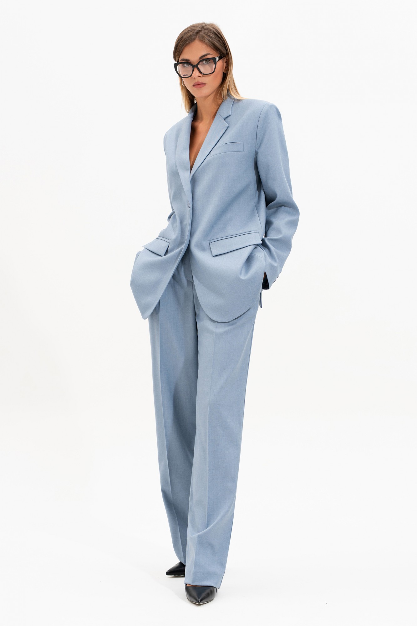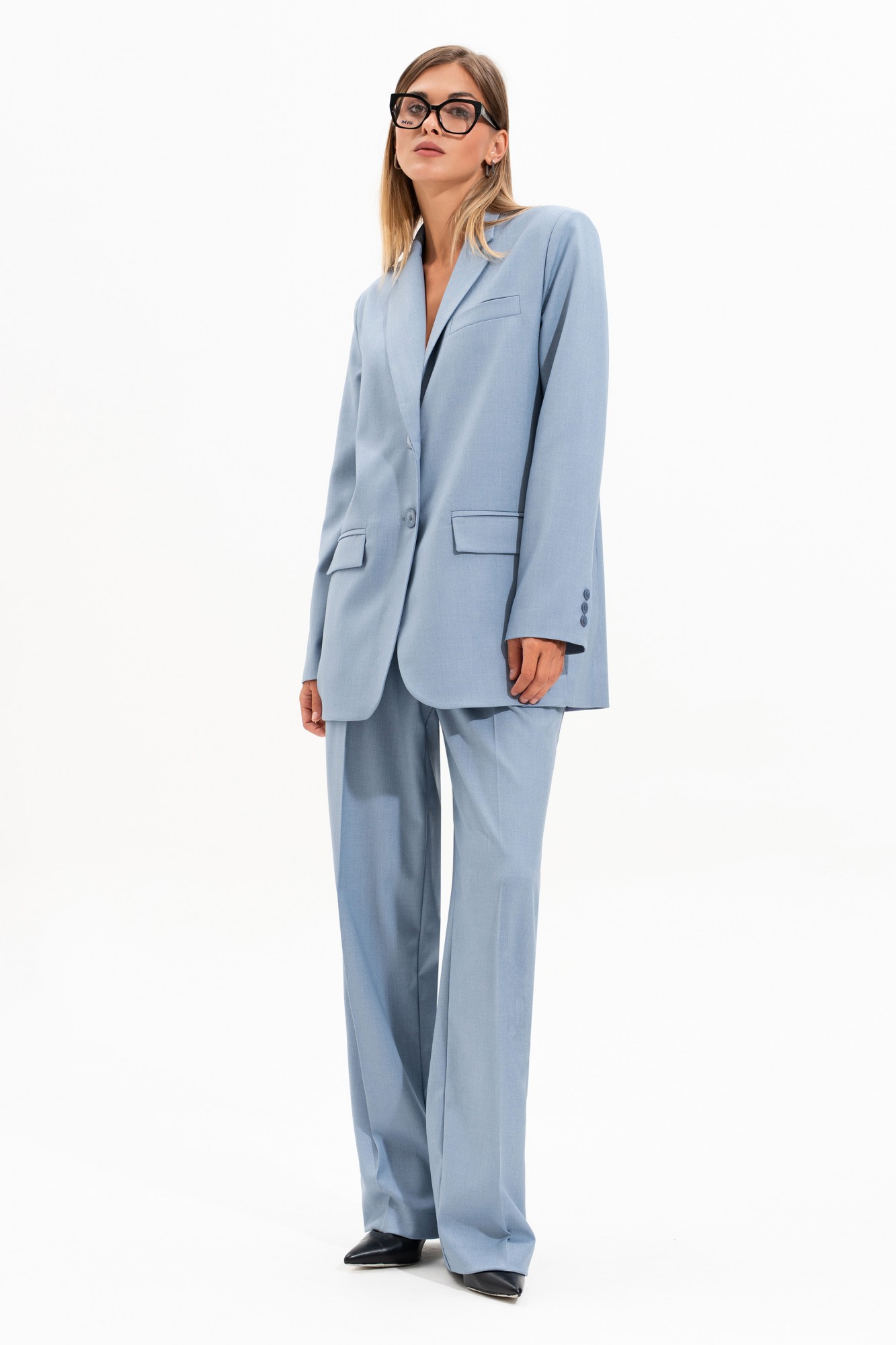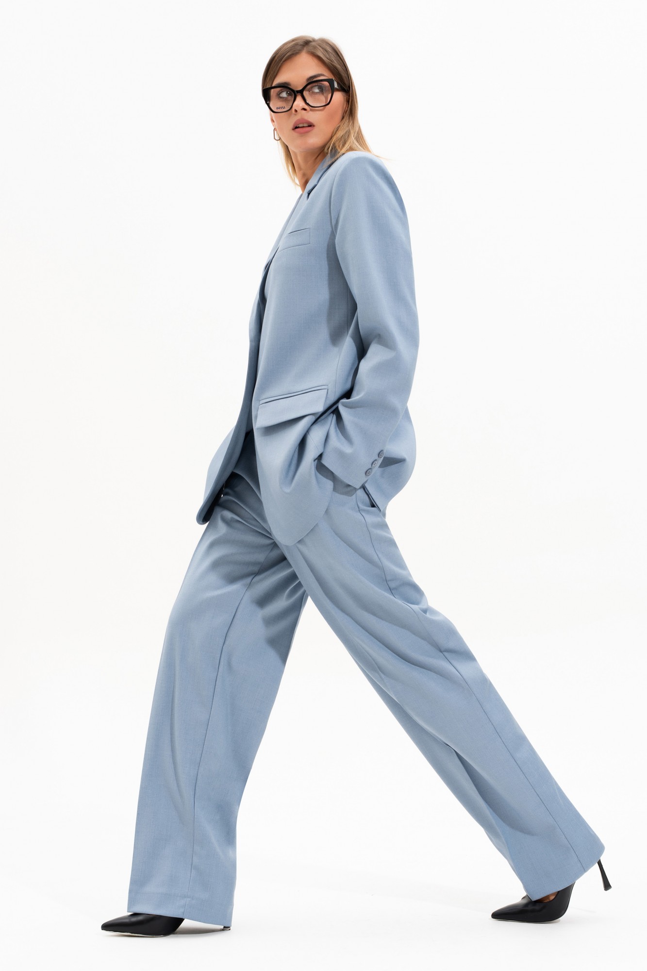 Брючный костюм. Идеальный крой и посадка. Жакет свободного силуэта, с цельнокроеными бочками, на поливискозной подкладке. Воротник пиджачного типа с отложным лацканом, на левой полочке листочка. Спереди прорезные карманы в рамку с клапаном. Спинка со средним швом и высокой отлетной шлицей (40 см.). Рукав втачной , двухшовный, со шлицей и пуговицами. Брюки актуального силуэта, свободные, прямые к низу. На передних половинках заутюжены стрелки, переходящие в складку по линии талии. Застежка-гульфик, по переду боковые наклонные карманы. Пояс стабильный по переду, по задней части брюк на резинке, с настроченными шлевками и застежкой на пуговичку. Благородство этого костюма просто зашкаливает. Абсолютно современный look, делает образ острым и элегантным, олицетворяя женщину 21 века.