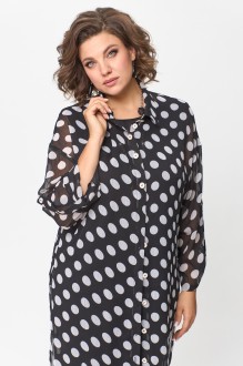 Брюки с поясом, по спинке резинка, застёжка потайная молния и петля пуговица. Топ с полукруглым вырезом и нагрудными вытачками. Рубашка удлинённая ниже колена с фигурными подрезами по бокам. Рукав втачной, длина рукава регулируется патой. Воротник рубашечного типа, застёжка на планке с пуговицами. Рубашку, топ и брюки можно носить отдельно с любыми другими изделиями.