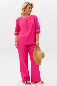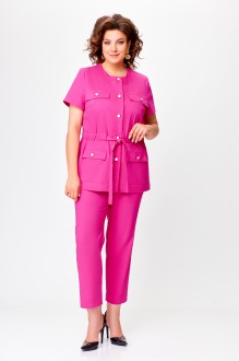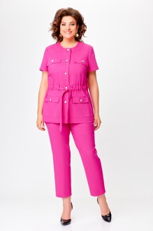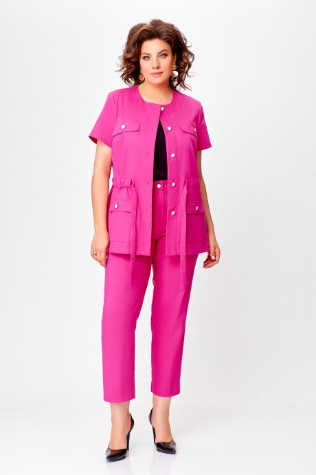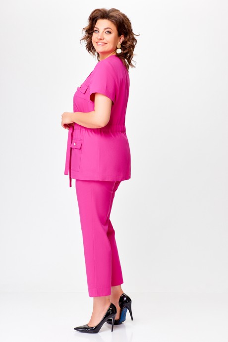 Костюм женский, состоит из жакета и брюк, выполнен из турецкого хлопка со стрейчем. Жакет прямого силуэта без подкладки, с центральной застёжкой на петли и металлические пуговицы. Полочка с нагрудными вытачками и надстрочными клапанами в области груди, в области бёдер расположены накладные карманы с клапанами, застёгивающиеся на петлю и пуговицу. Спинка со средним швом. По линии талии расположена кулиса с завязывающимся поясом. Горловина круглая, рукав втачной, короткий. Брюки прямые, зауженные к низу, верх брюк обработан притачным поясом с резинкой по спинке. По переду карманы с отрезными бочками. Застёжка на тесьму-молнию, петлю и металлическую пуговицу на поясе.