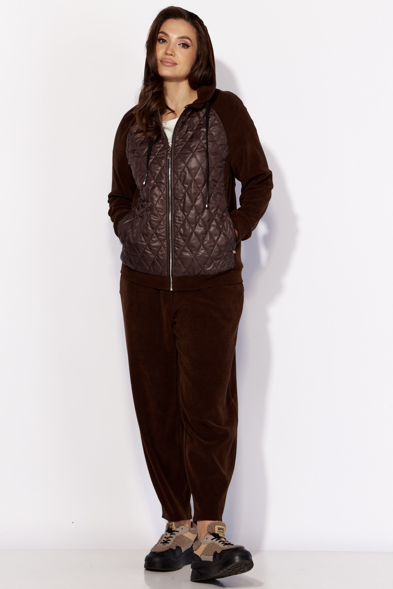Комплект женский, 2хпредметный, состоящий из куртки и брюк. Куртка прямого силуэта с длинным рукавом. Рукав "реглан" с манжетой по низу. По переду и спинке рельефы из пройм. Спереди, в рельефах, карманы. Застежка центральная , на "молнию". Горловина оформлена капюшоном с кулисой по краю. Низ куртки на манжете. Центральные детали переда и спинки из стежки (плащевка на синтепоне.) Брюки-слаксы, объемные, к низу зауженные. Карманы в боковых швах. Сзади накладной карман с декоративной нашивкой. Пояс цельнокройный, на резинке.