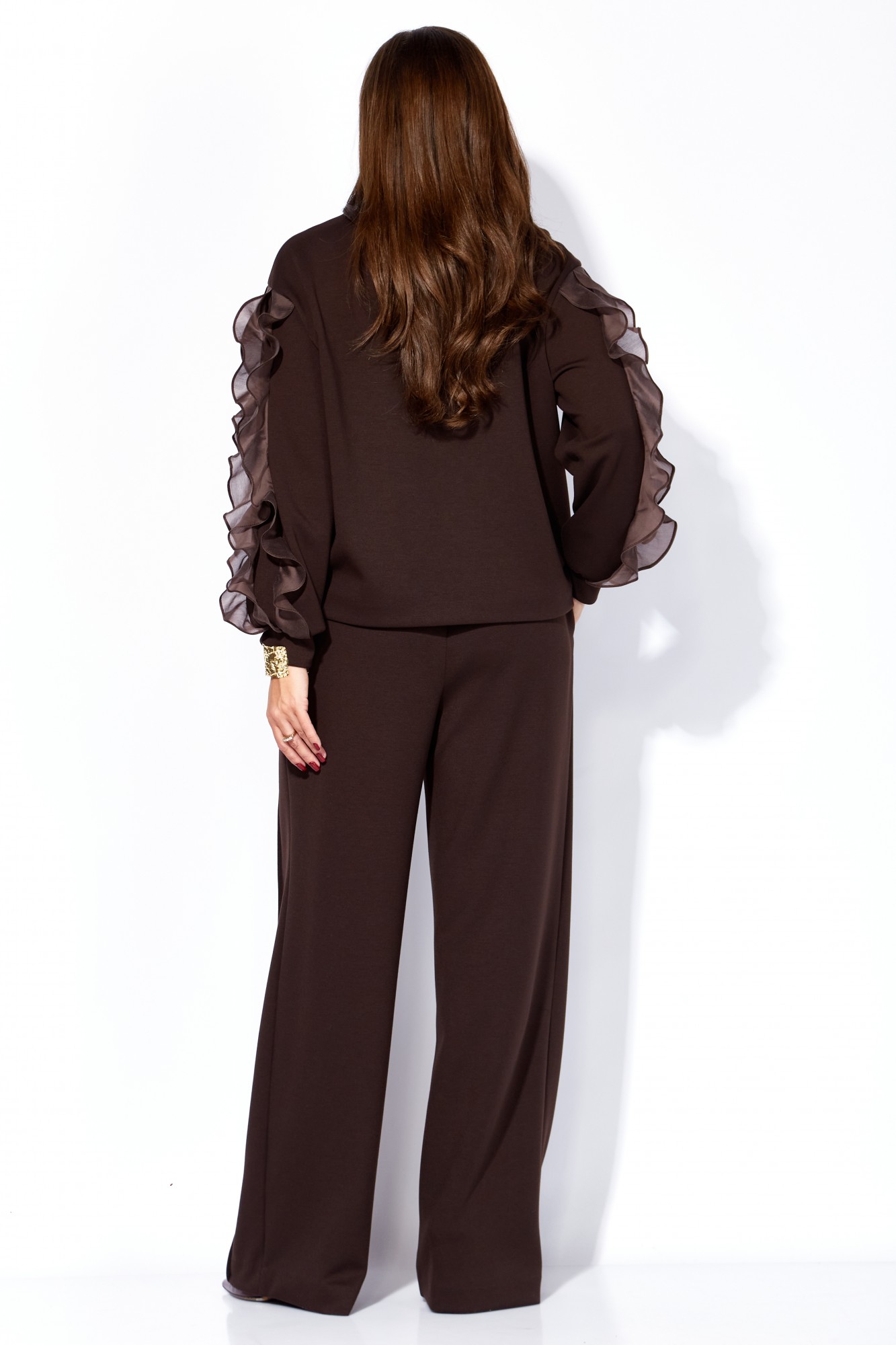 Комплект женский, 2х предметный, состоящий из джемпера и брюк, из трикотажного полотна. Джемпер прямого силуэта, с длинным рукавом. Рукава с чуть спущенной линией плеча, по низу на манжете, задекорирован по центру тремя рядами рюш из отделочной ткани. Вырез горловины круглой формы, с отделочной бейкой по переду. По низу переда подрезная планка. Спинка без особенностей. Брюки прямые, широкие. По переду по три ряда широких, застроченных "на ребро" рельефов и функциональные карманы. Пояс притачной с резинкой по кругу.
