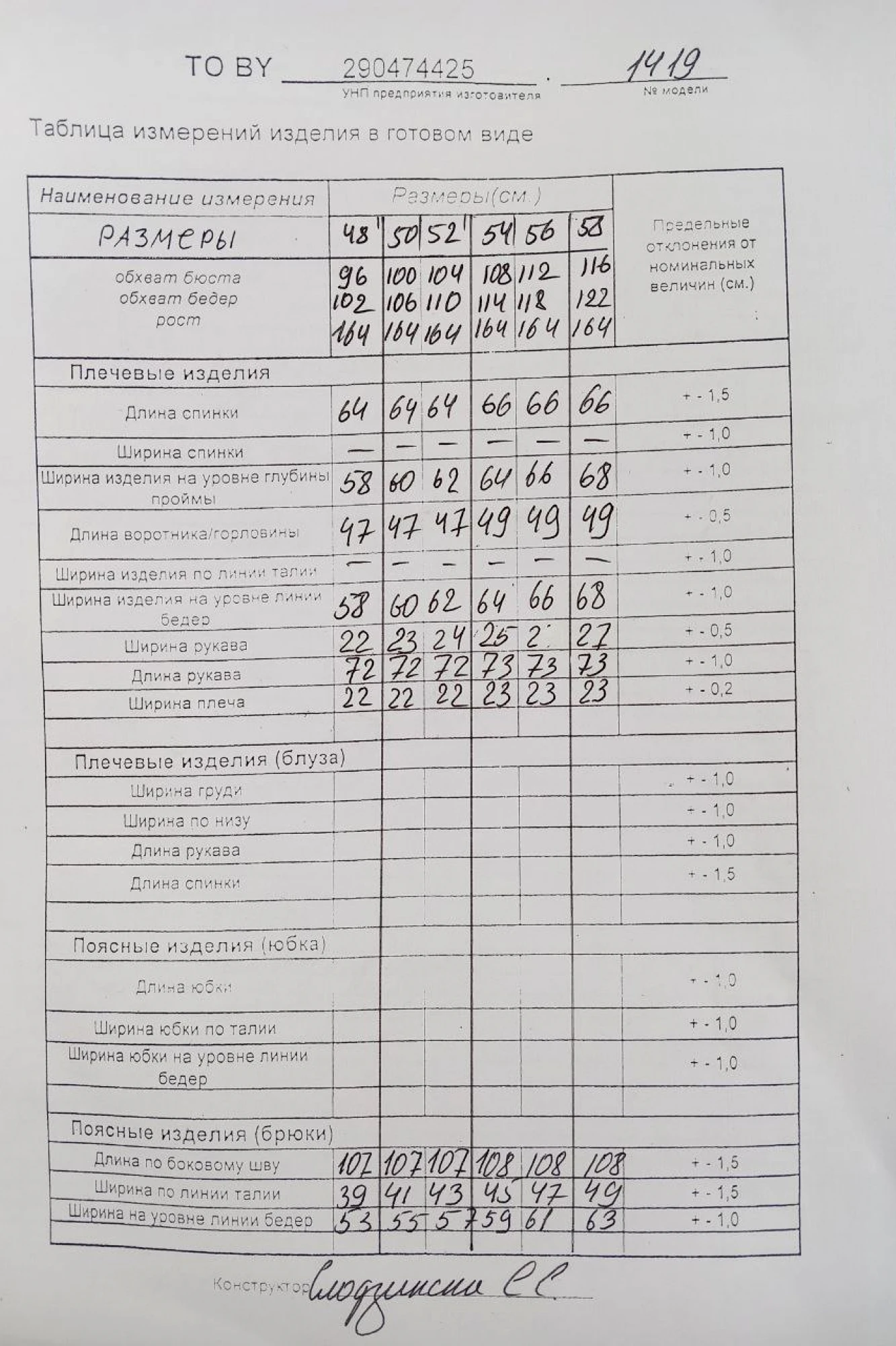 Таблица размеров