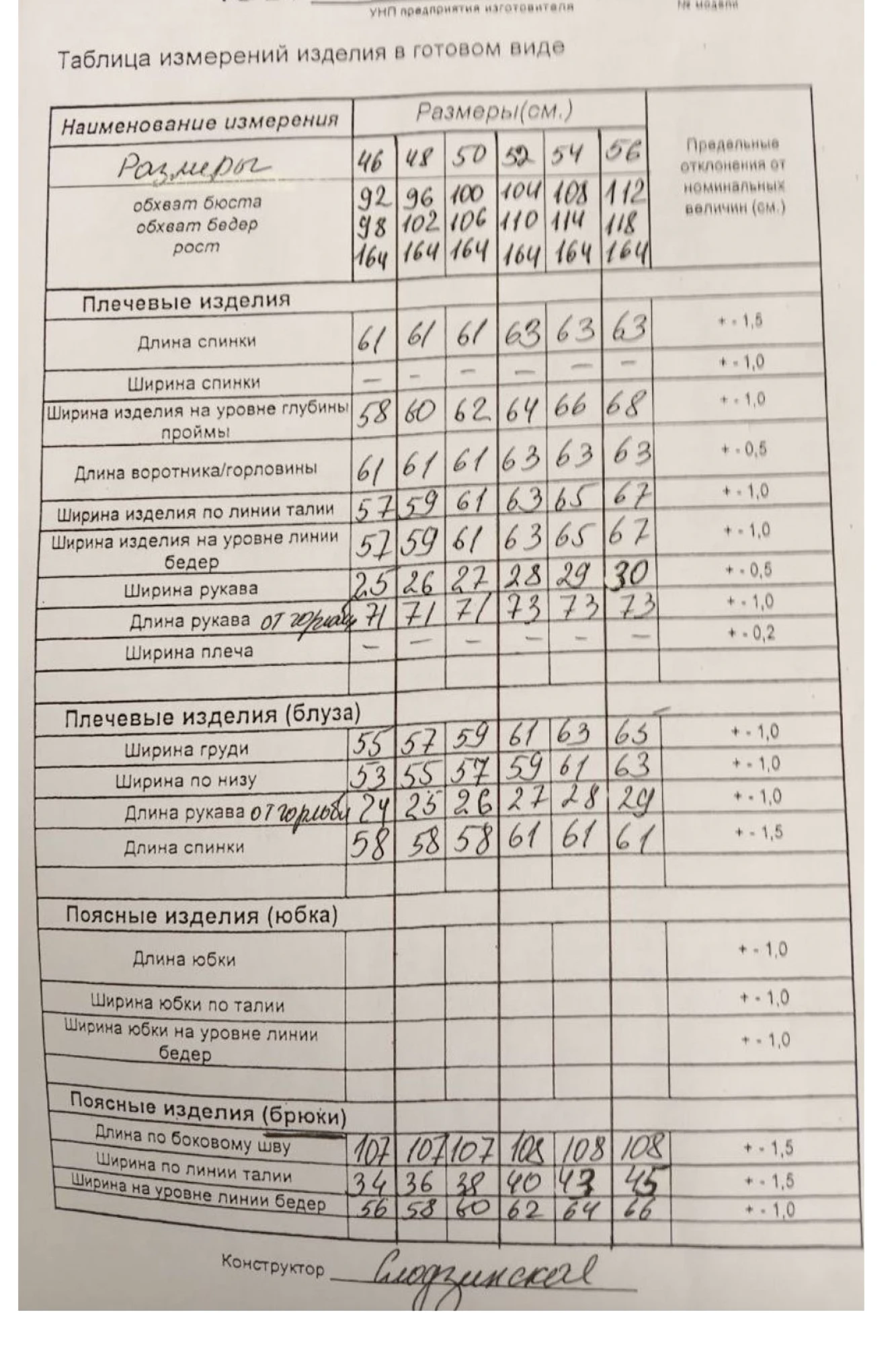 Таблица размеров