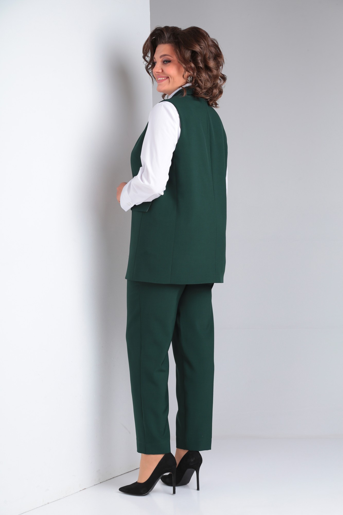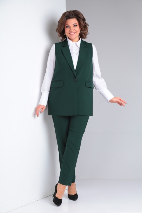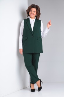 Комплект состоит из жилета и брюк. Жилет из костюмной ткани на подкладке, полуприлегающего силуэта, с лацканами, отложным воротником, центральной бортовой застежкой на петли и пуговицы. Перед с отрезными бочками, прорезными карманами в рамку с клапаном. Спинка с отрезным бочком и средним швом. Длина 78 Брюки из костюмной ткани, свободного силуэта, зауженные к низу, с карманами в боковых швах, на поясе с резинкой. Длина 105.