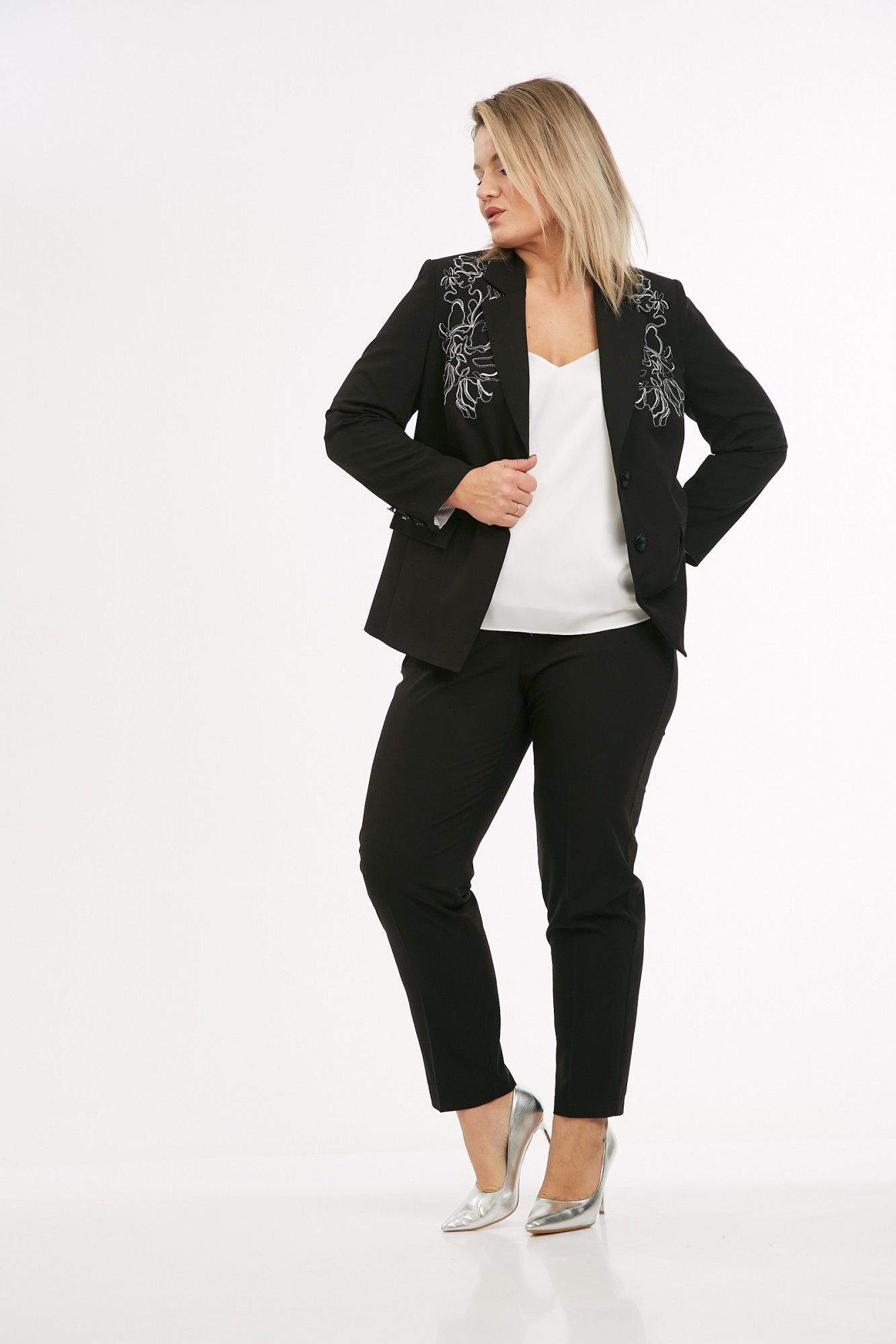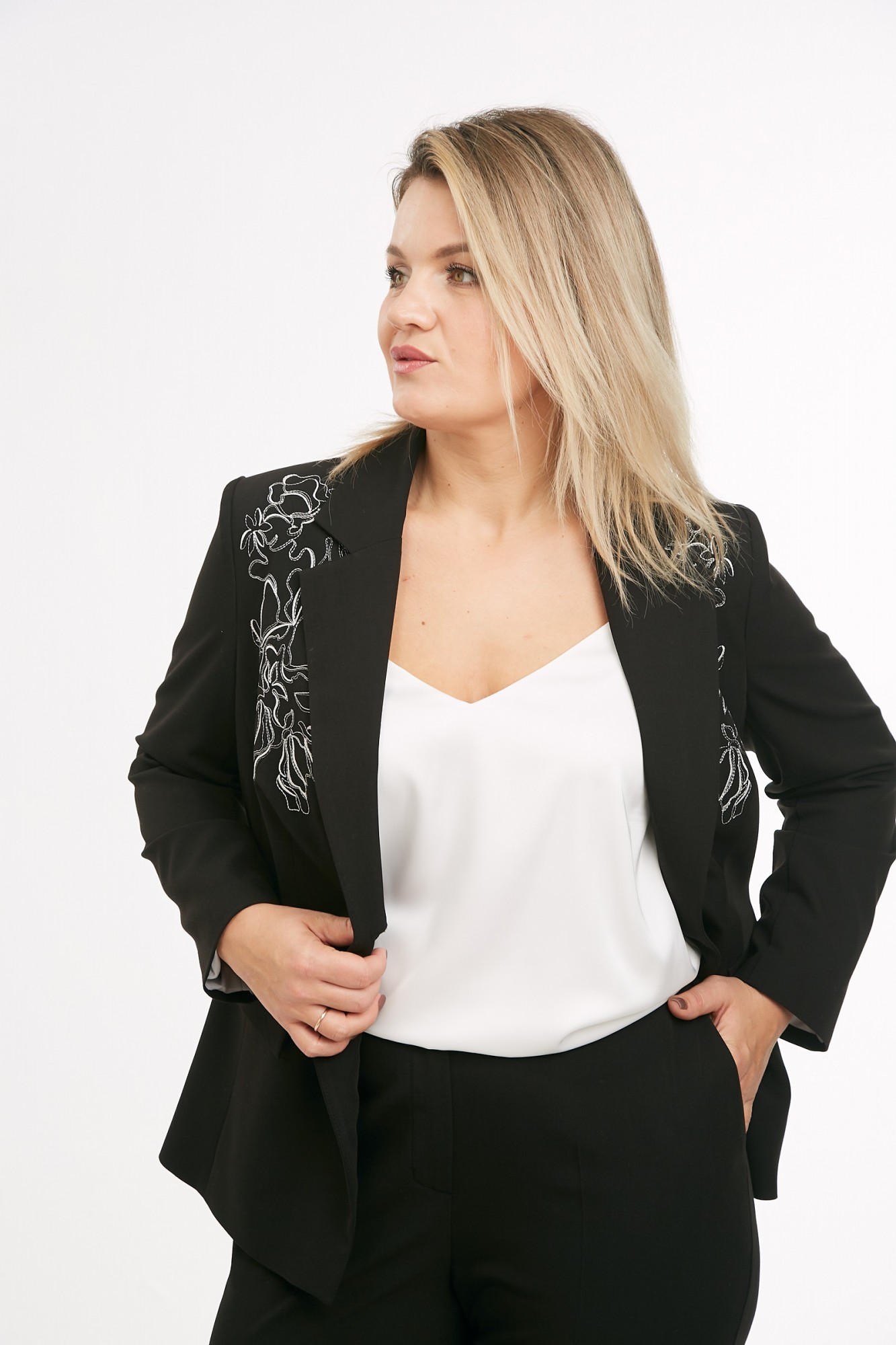 Жакет из костюмной ткани на подкладке, полуприлегающего силуэта, с отложным воротником и лацканами, с центральной бортовой застежкой на петли и пуговицы. Перед с талиевыми вытачками, прорезными карманами с клапаном и вышивкой в области груди. Спинка со средним и рельефными швами. Рукав втачной двухшовный. Воротник отложной пиджачного типа.