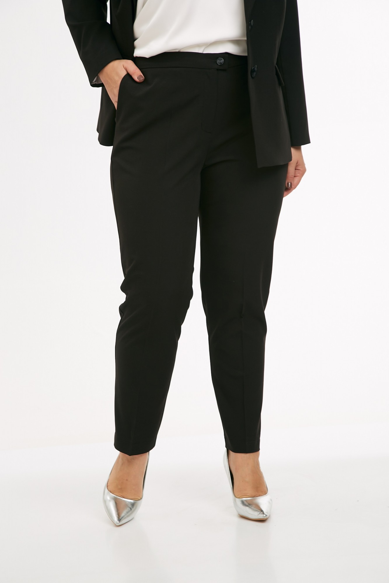 Брюки зауженные к низу, с карманами в боковых швах, гульфиком с застежкой-«молнией», на поясе с резинкой по спинке, и застежкой на петли и пуговицы.