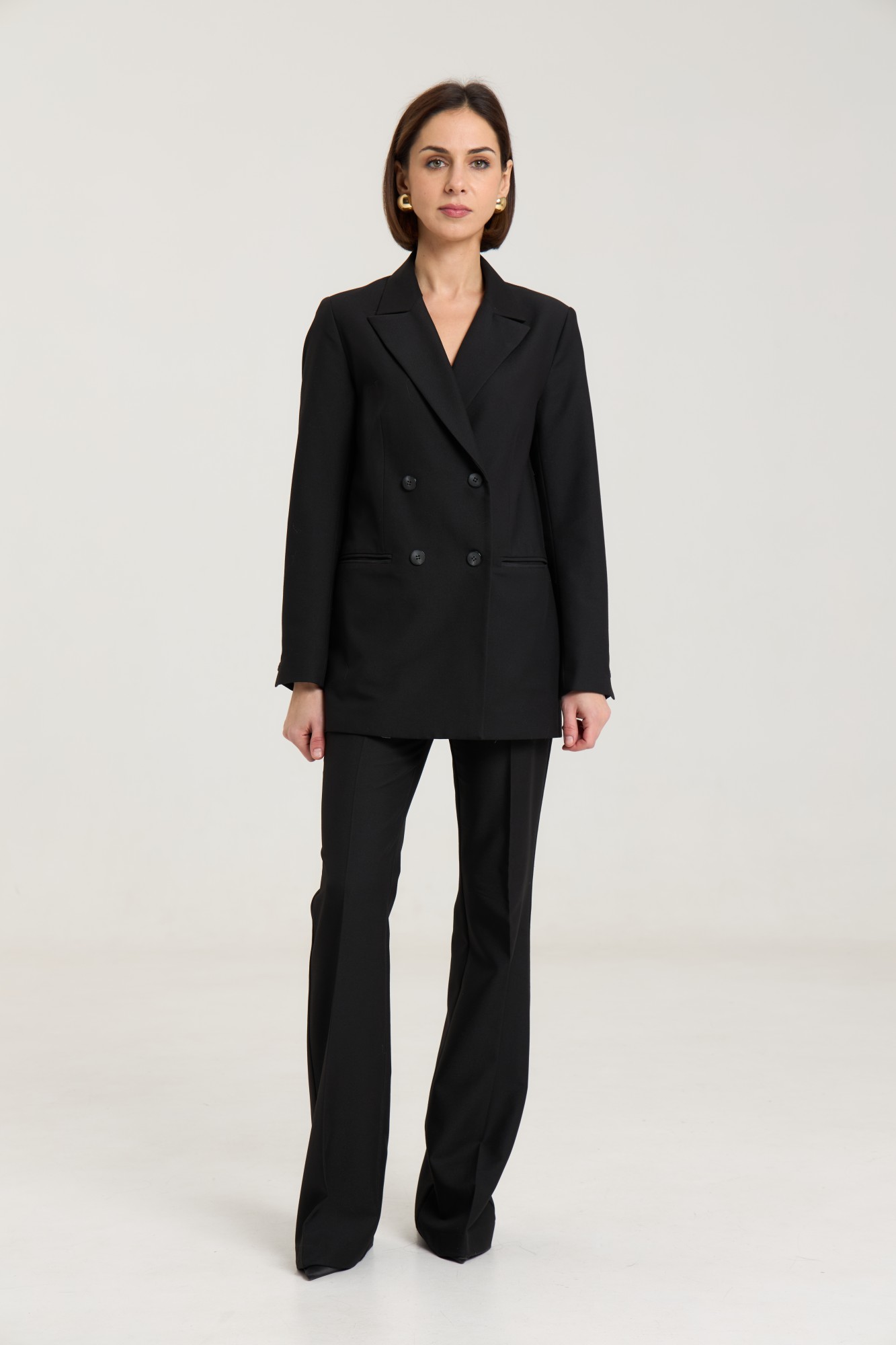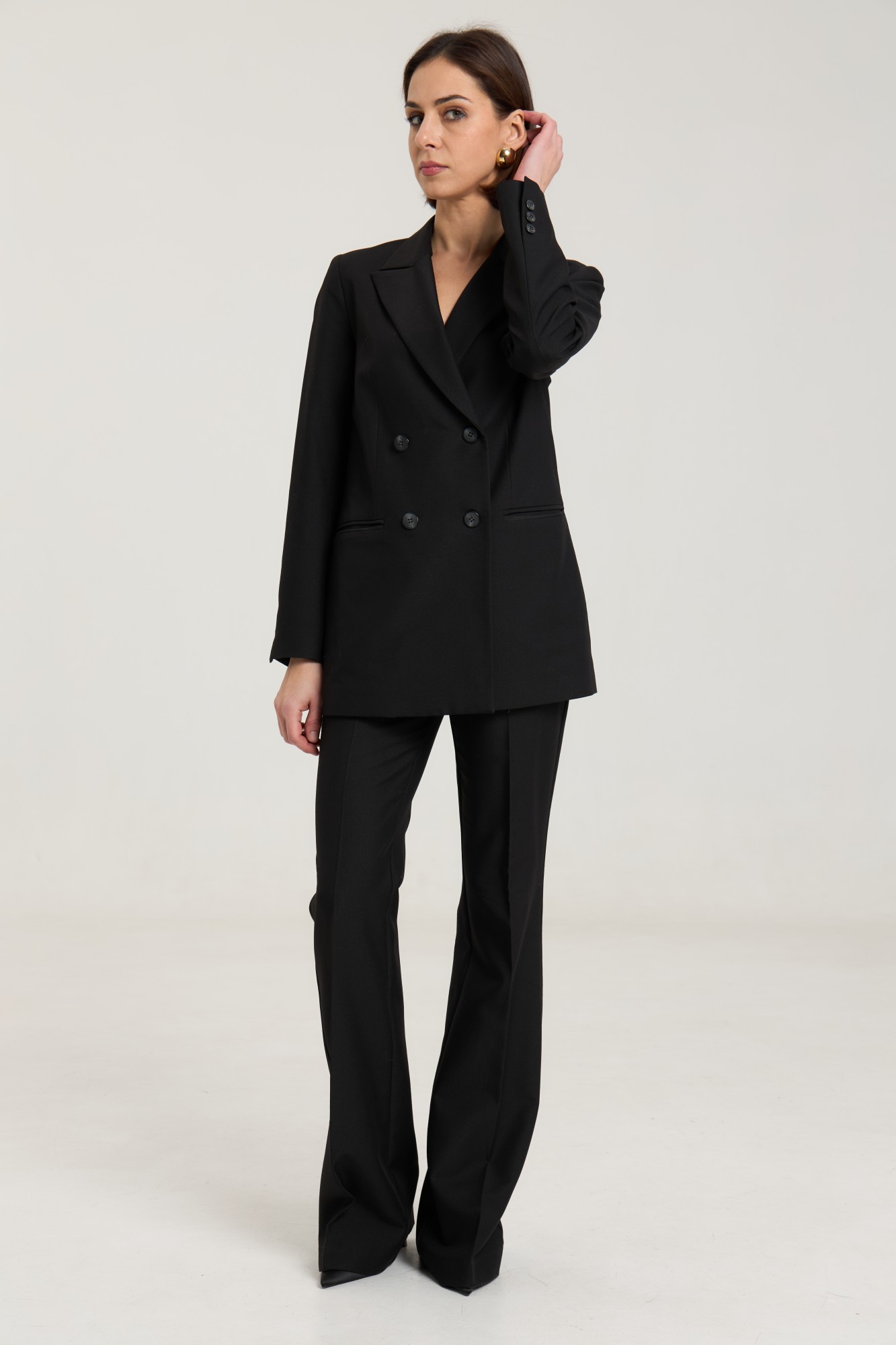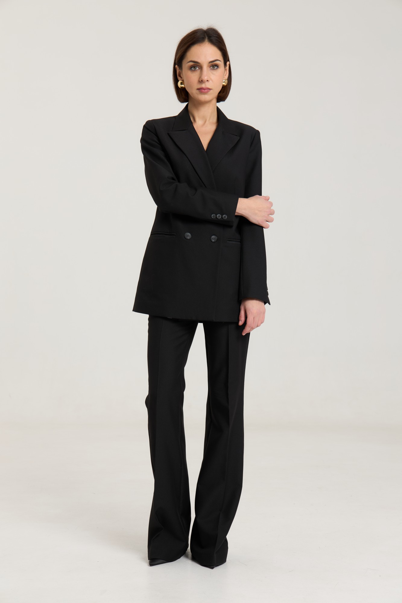 Комплект двухпредметный из жакета и брюк. Жакет двубортный, с нагрудными выточками, прорезные карманы в рамку с клапанами, застежка на петли и пуговицы, спинка со средним швом, втачные двухшовные рукава, с тремя отделочными пуговицами, жакет на подкладке. Выполнен из премиальной ткани костюмной группы. Классические расклешенные брюки полуприлегающего силуэта с высокой посадкой, пояс притачной со шлевками, застежка на молнию и петлю-пуговицу, брюки без карманов. Выполнены из премиальной ткани костюмной группы.