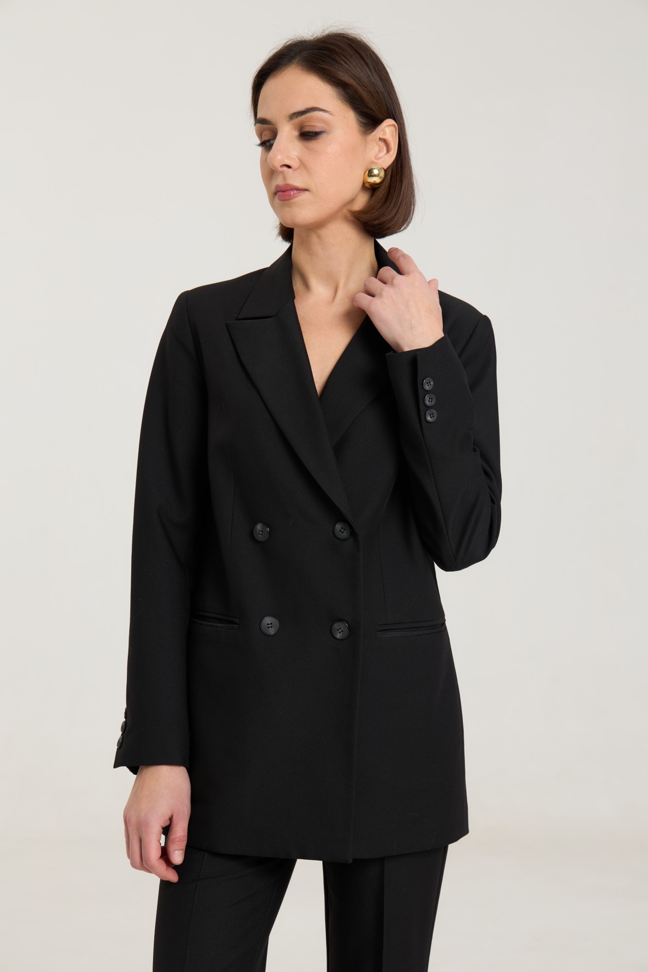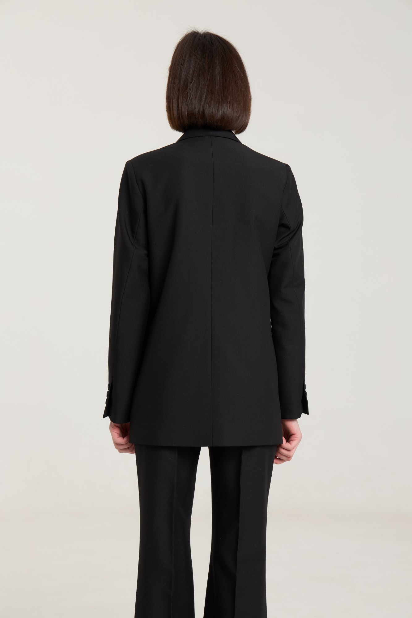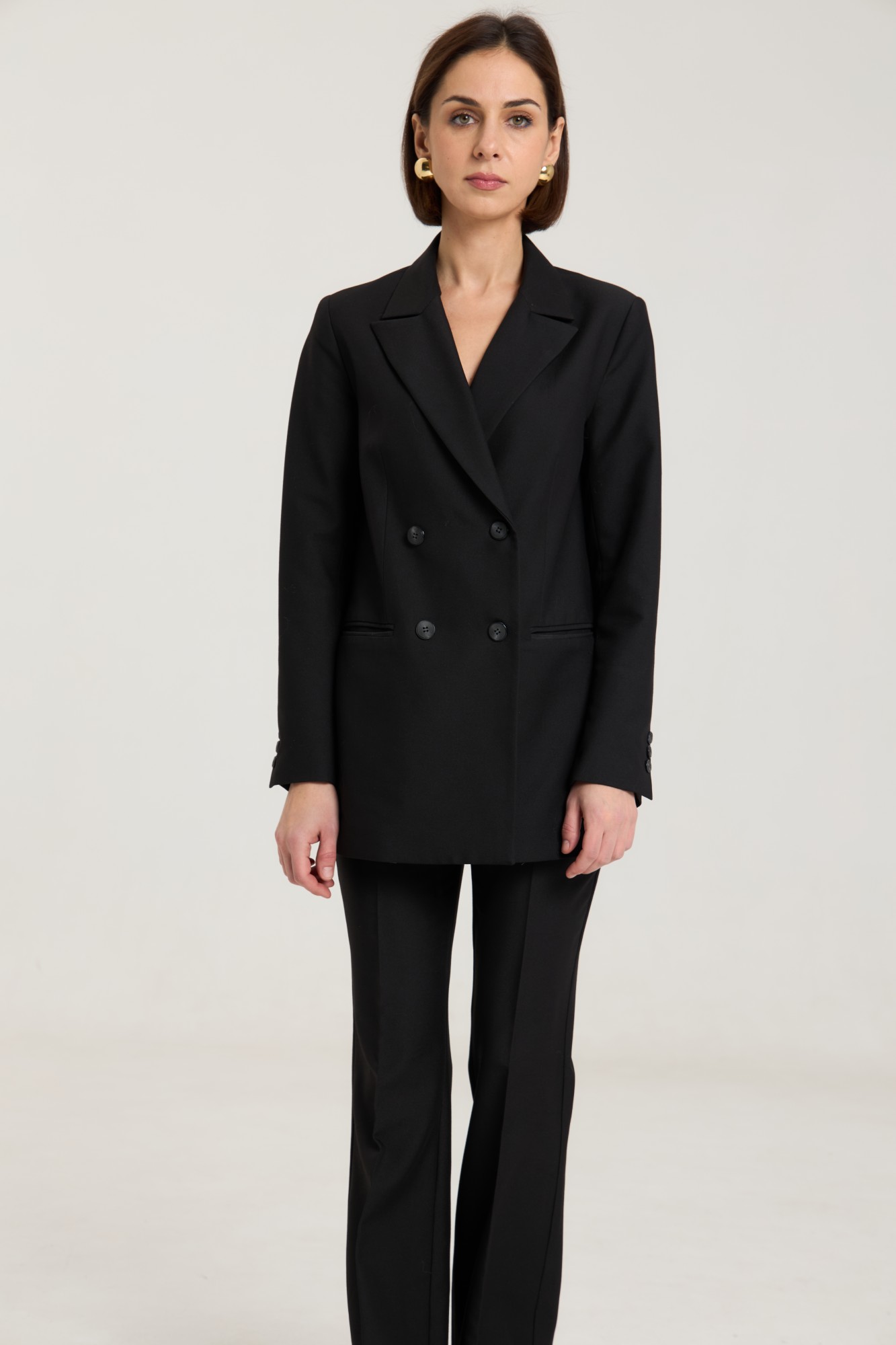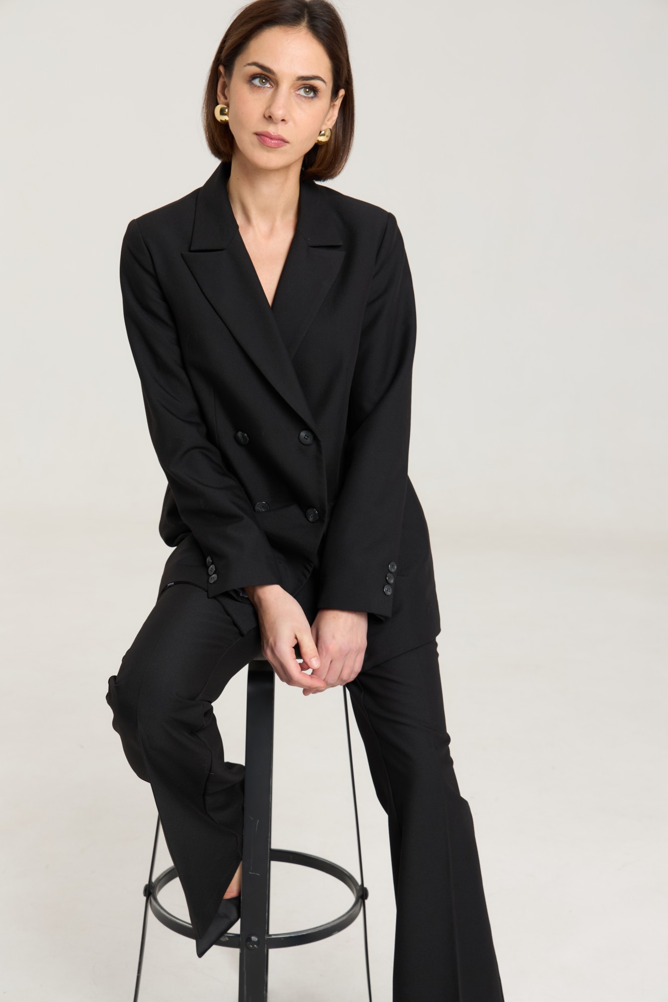 Комплект двухпредметный из жакета и брюк. Жакет двубортный, с нагрудными выточками, прорезные карманы в рамку с клапанами, застежка на петли и пуговицы, спинка со средним швом, втачные двухшовные рукава, с тремя отделочными пуговицами, жакет на подкладке. Выполнен из премиальной ткани костюмной группы. Классические расклешенные брюки полуприлегающего силуэта с высокой посадкой, пояс притачной со шлевками, застежка на молнию и петлю-пуговицу, брюки без карманов. Выполнены из премиальной ткани костюмной группы.