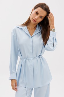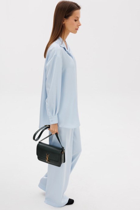 Комплект двухпредметный из рубашки и брюк. Нежный комплект в красивом голубом оттенке, брюки или рубашку вы всегда сможете носить отдельно. Образ сочетает в себе шик и расслабленность. В комплекте идет съёмный пояс из основной ткани. Прямые брюки из струящегося атласа бесспорно станут вашим фаворитом в гардеробе, талия высокая, брюки на резинке, длина по боковому шву 110 см. Вещи из атласа отлично вписываются в любой стиль и подходят для разных поводов, удобная посадка, не сковывают движения. Роскошная блуза из атласной ткани в необычном мраморном сером цвете. Рубашка свободного кроя с заниженной линией плеча. Рукав рубашечный, длинный с притачной манжетой. Застёжка центральная на петли - пуговицы. Низ блузки фигурной формы. Воротник стояче-отложной с отрезной стойкой.