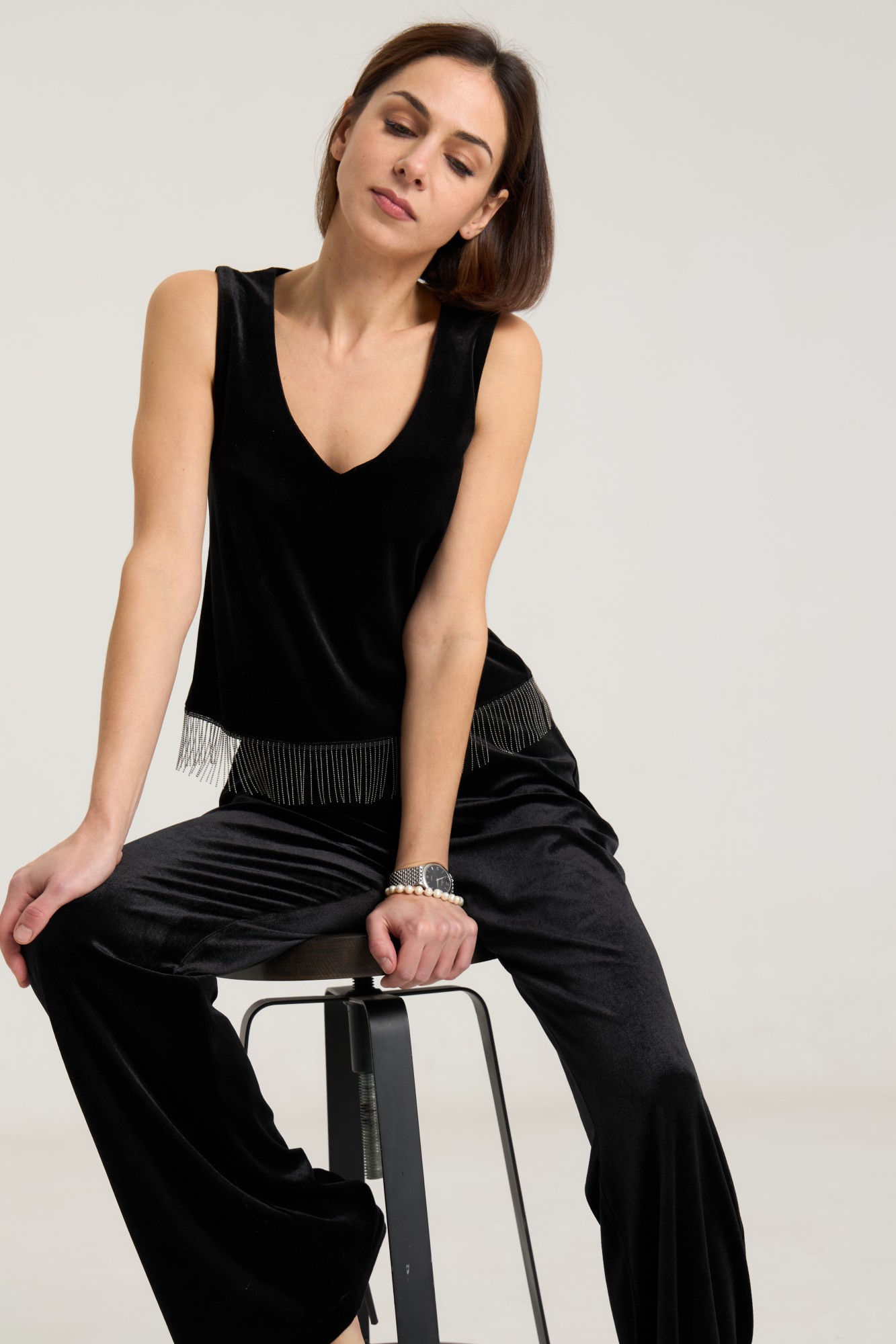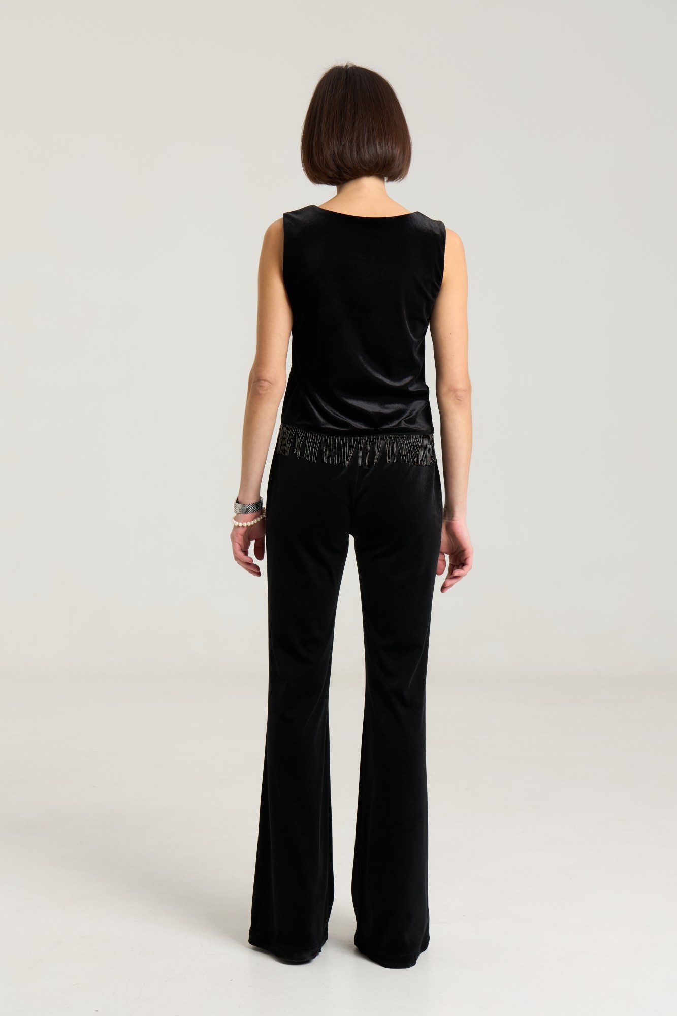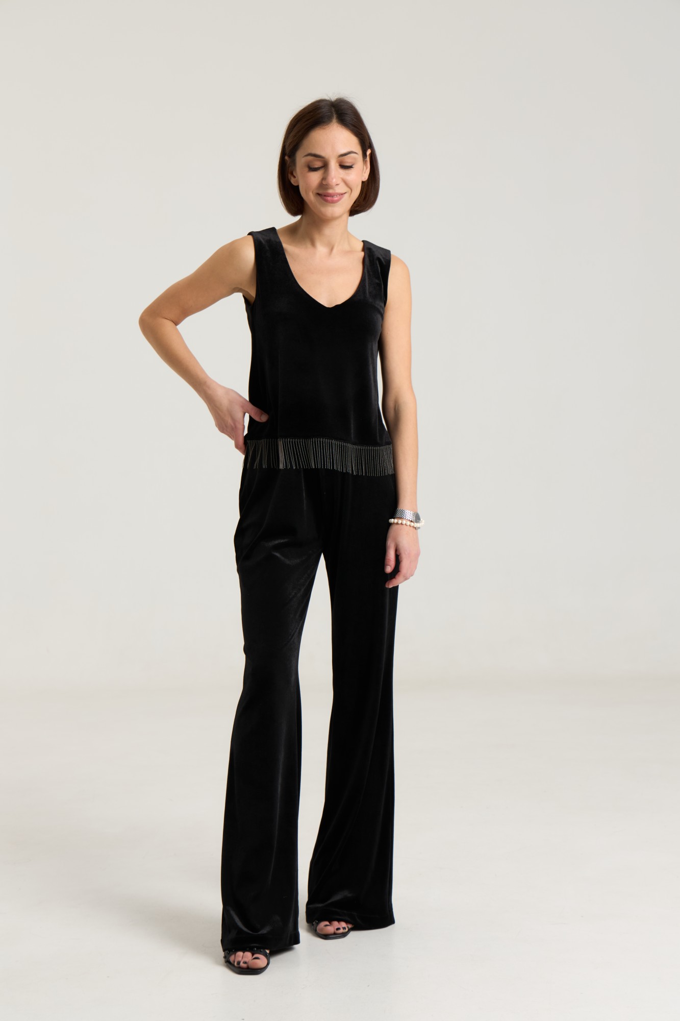 Комплект из топа и брюк. Брюки расклешенные свободного кроя из велюровой ткани - это не только модель для праздника. Топ свободного кроя выполнен из велюровой ткани черного цвета, на обтачке по переду и спинке, с углубленным вырезом.