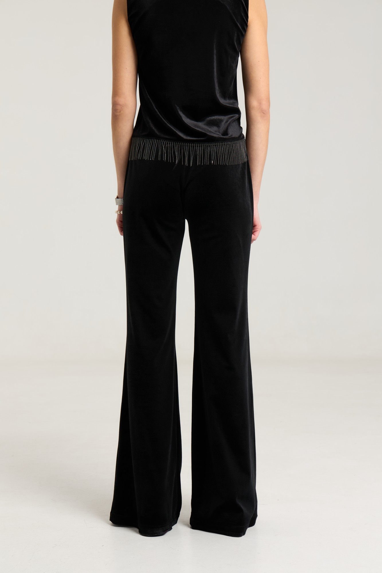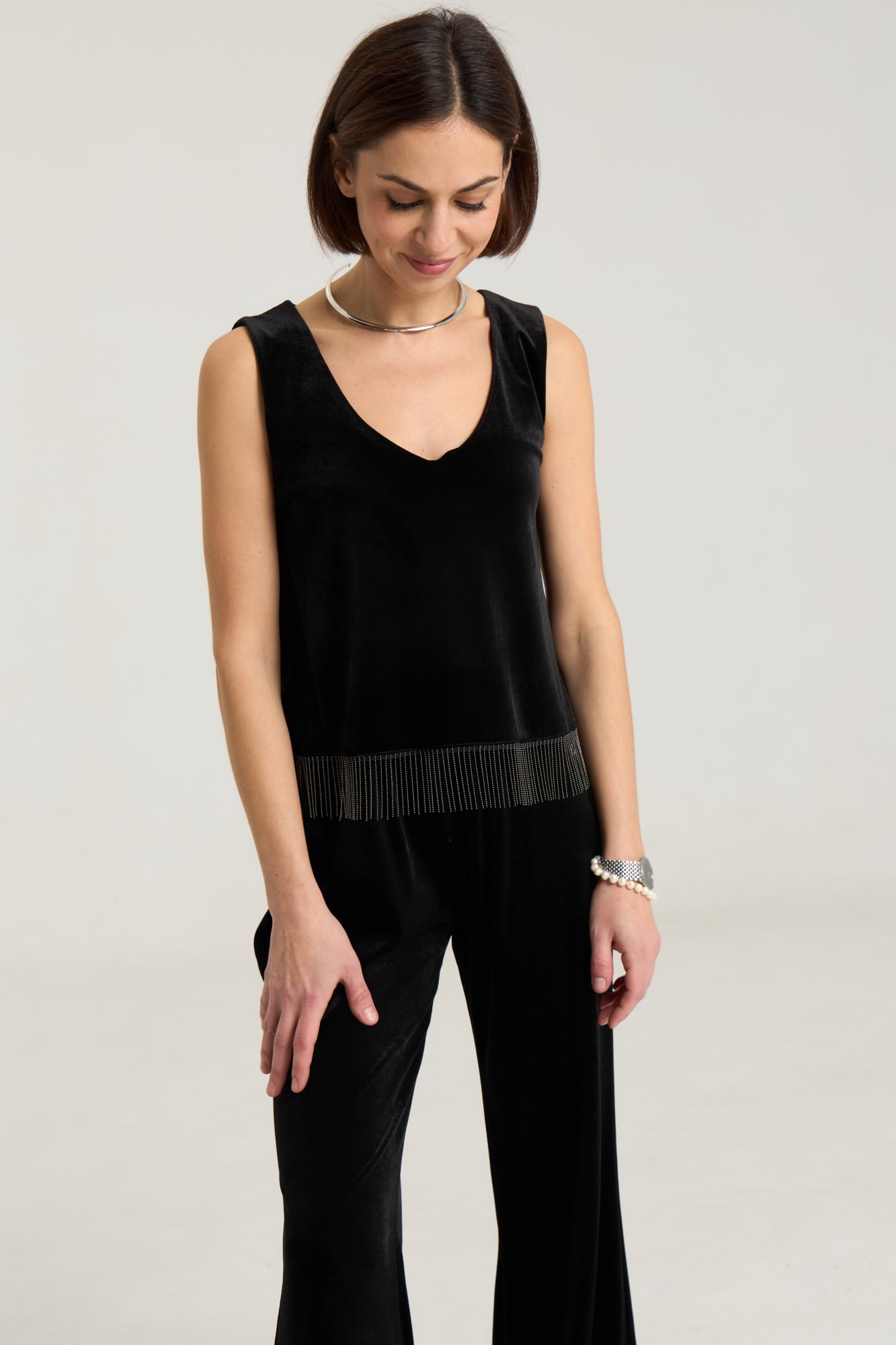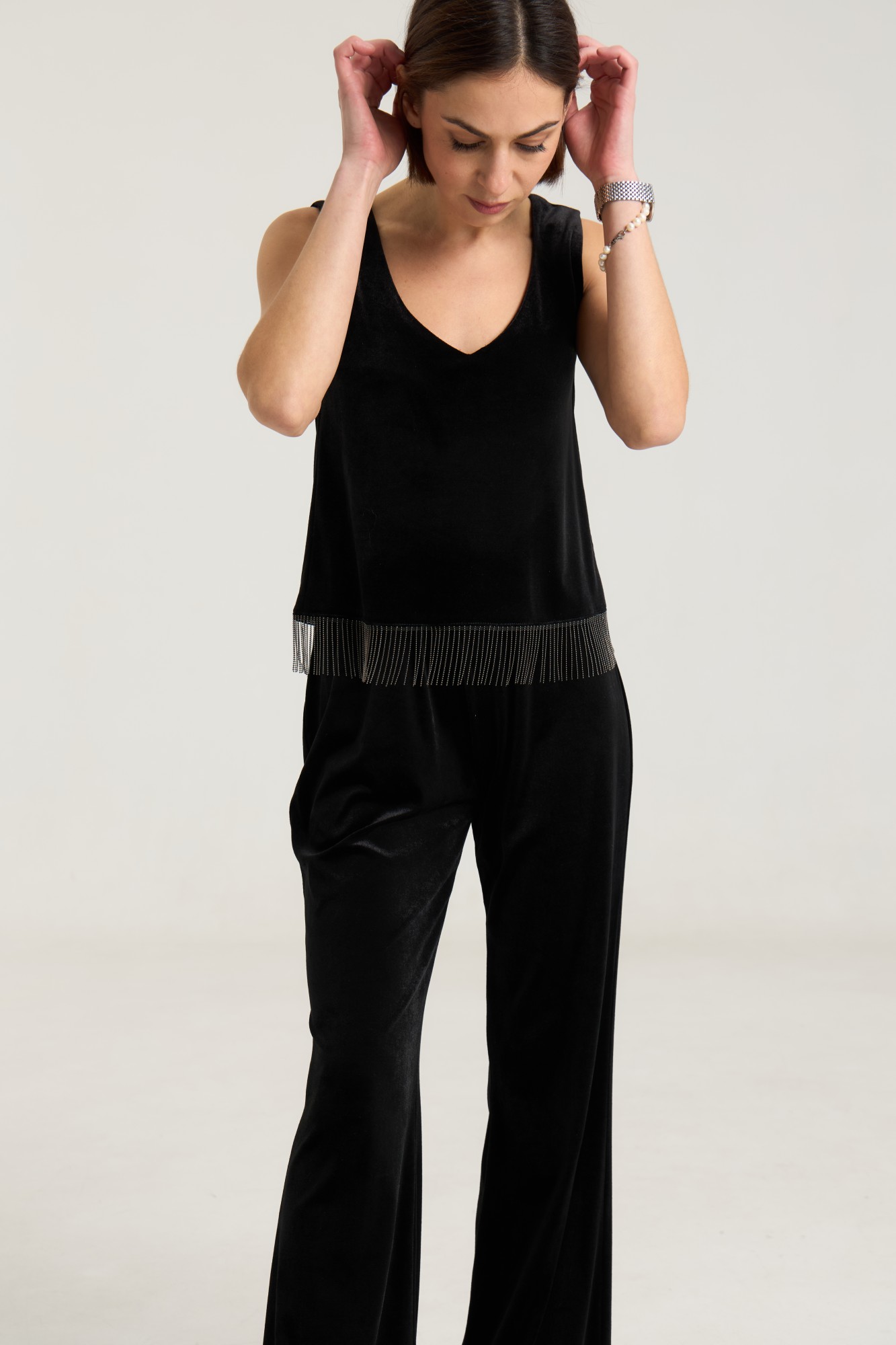 Комплект из топа и брюк. Брюки расклешенные свободного кроя из велюровой ткани - это не только модель для праздника. Топ свободного кроя выполнен из велюровой ткани черного цвета, на обтачке по переду и спинке, с углубленным вырезом.