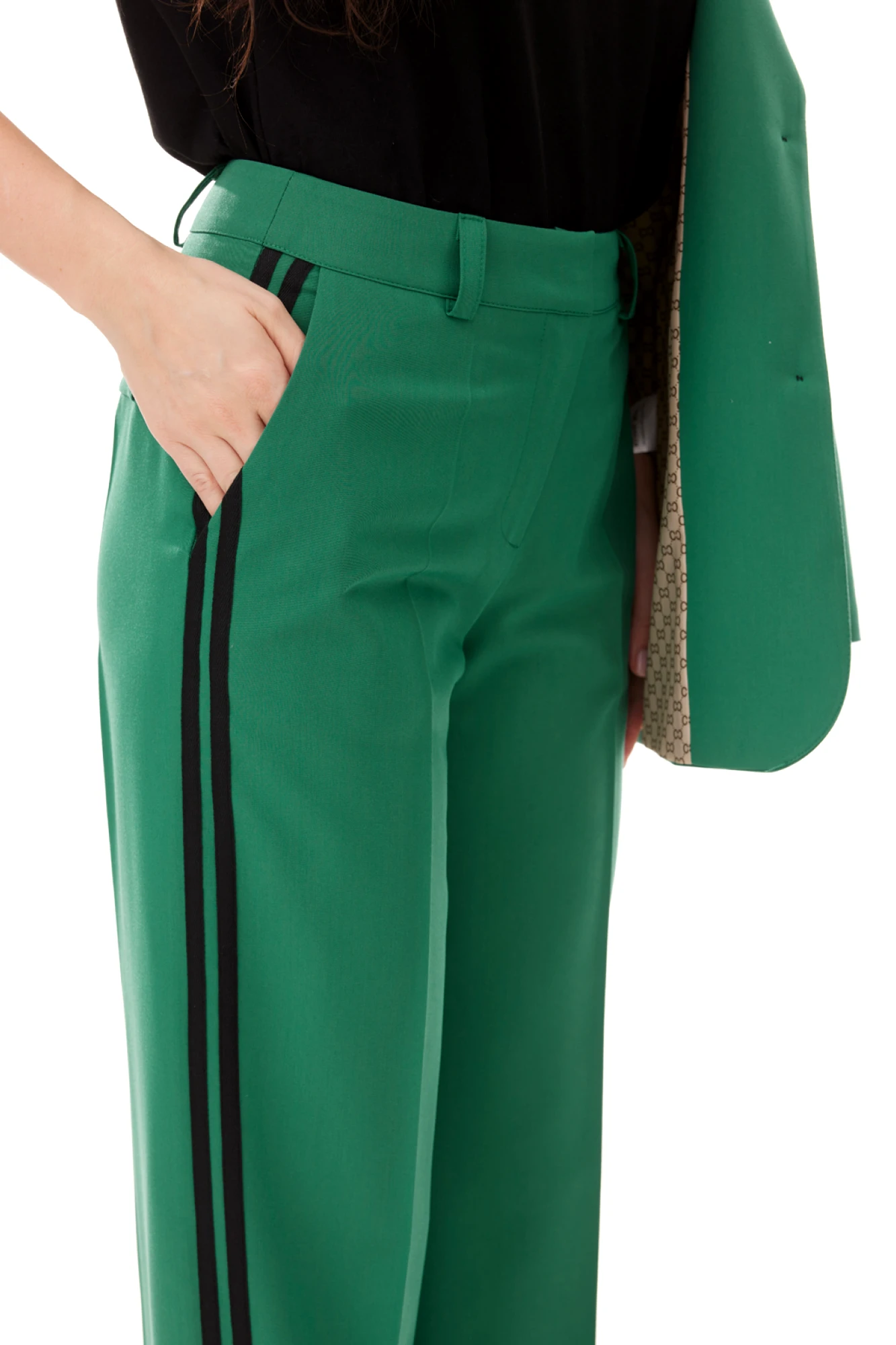 жакет и брюки - вискоза 87%, полиэстер 13%; подкладка - вискоза 95%, эластан 5%; футболка - хлопок 95%, эластан 5%