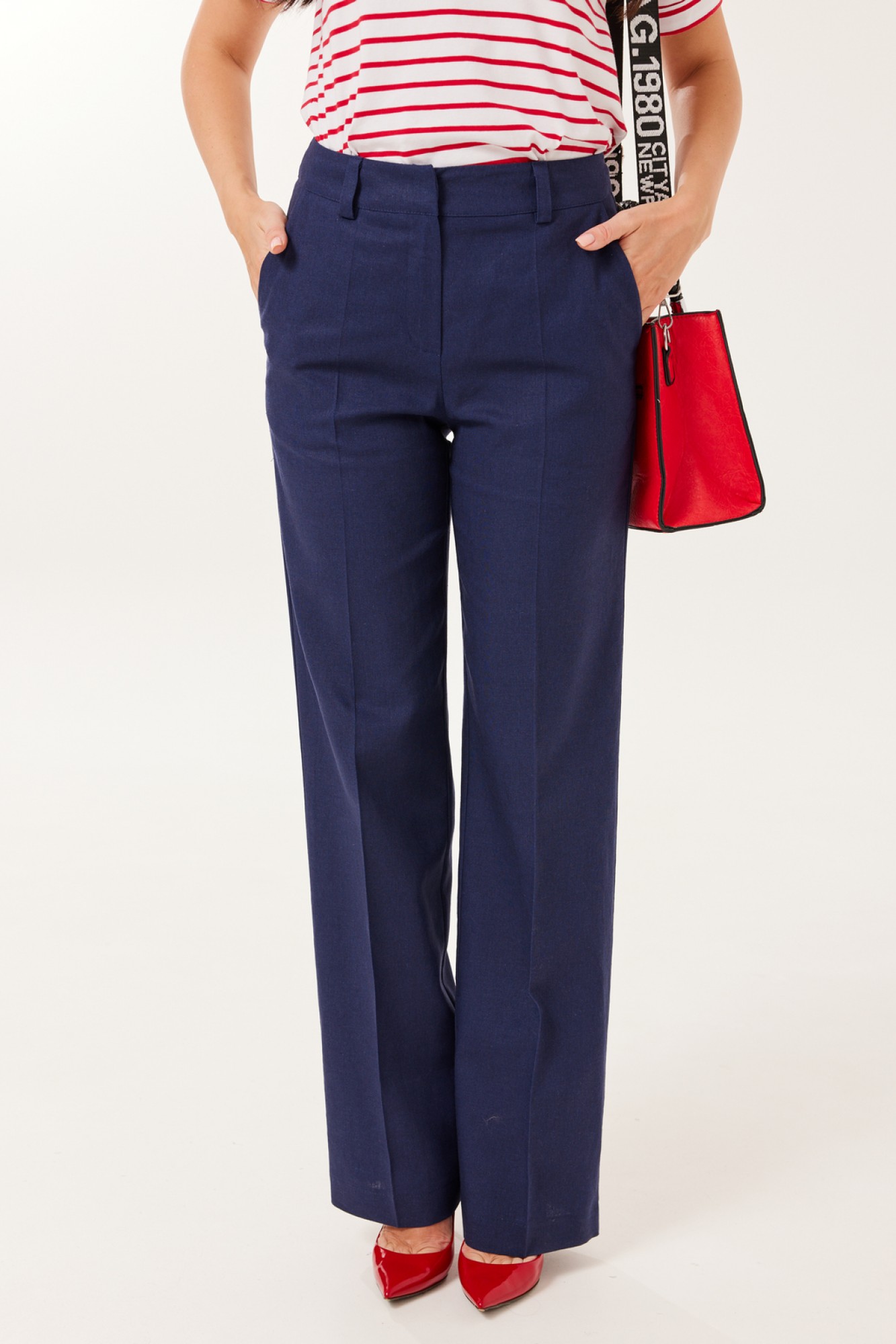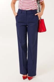 Комплект женский 3-х предметный, состоящий из жакета, брюк и футболки. Жакет и брюки выполнены из поливискозы с добавлением льна. Жакет полуприлегающего силуэта, на подкладке, с двухбортной застежкой на петли и декоративные пуговицы в морской тематике. Горловина жакета оформлена воротником пиджачного типа, на лацкане которого декоративная брошь. Рукава двухшовные длинные с возможностью подворота длины. В области бедер обработаны прорезные карманы "в рамку" с клапаном. Спинка со средним швом и рельефами. Брюки классической формы, прямого силуэта, со стрелками по передним и задним половинкам. Верхний срез обработан притачным поясом, по спинке вставлена резинка для регулировки обхвата талии. По центру переда - застёжка на крючок и тесьму-молнию. На задних половинках расположны талевые выточки, в боковых швах расположены наклонные карманы. Футболка выполнена из трикотажного полотна с принтом "полоска". Футболка прямого силуэта с короткими рукавом, по низу которых - цельнокроенная манжета.