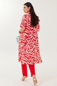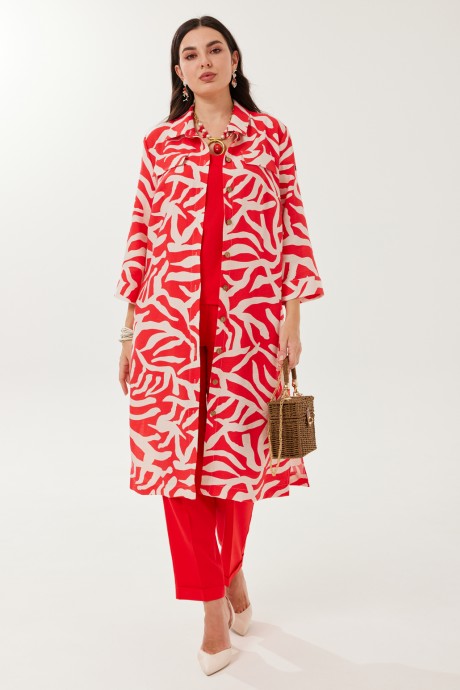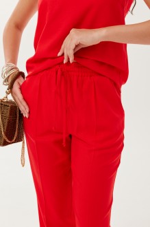 Костюм женский 3-х предметный, состоящий из блузы, брюк и топа. Брюки и топ выполнены из поливискозы с добавлением льна. Блуза - из поливискозы. Брюки классической формы, слегка заужены к низу со стрелками по передним и задним половинкам. Но низу брюк манжета. Верхний срез обработан притачным поясом на резинке. По центру переда - застёжка-обманка, по поясу брюк обработаны петли, из которых выходит шнур для регулировки талии. В боковых швах расположены наклонные карманы. Блуза прямого силуэта, длиной мидакси, с центральной застёжкой на петли и пуговицы. По переду расположены нагрудные выточки. Горловина обработана воротником рубашечного типа. Рукава регулируются по высоте при помощи паты, которая застёгивается на петлю и пуговицу. В нижней части боковых швов обработаны разрезы. Топ на широких бретелях, прямого силуэта.