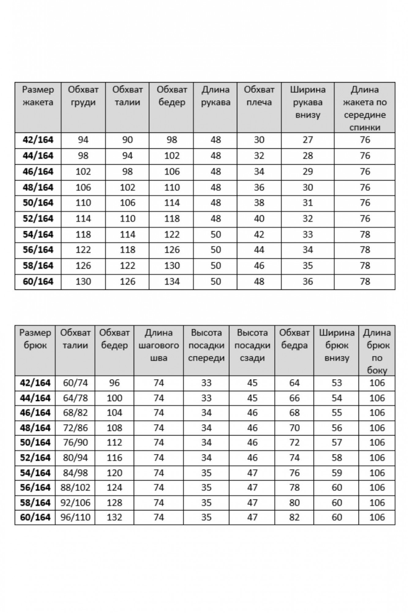 Костюм состоит из жакета и брюк. Качественная поливискоза, из которой выполнена модель, обеспечит долговечность изделию и приятные ощущения его обладательнице. Жакет без подкладки прямого силуэта, с двубортной застежкой на петли-пуговицы, длиной до середины бедра. Перед жакета с нагрудными вытачками, в области груди расположена декоративная листочка. Спинка с двойной кокеткой, в шве притачивания которой обработана встречная складка. Низ жакета фигурный, с закруглениями по боковым швам. Рукава двушовные, длиной 3/4, по низу с манжетой, застегивающейся на петлю и пуговицу. Горловина оформлена воротником пиджачного типа. Брюки классической формы, прямые от линии бедер, со стрелками по передним и задним половинкам. Верхний срез обработан поясом, в который от бокового шва вставлена резинка по задним половинкам. В боковых швах обработаны наклонные карманы. На задних половинках расположены талиевые вытачки. В комплект входит пояс из основной ткани.