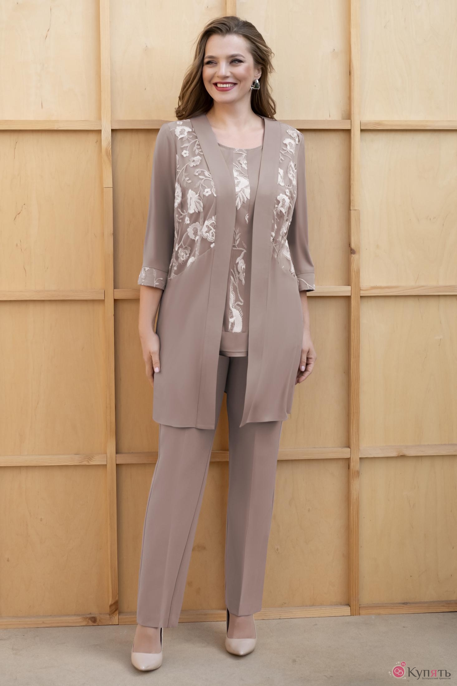 Прекрасный наряд для торжественного мероприятия! Костюм женский тройка. Состоит костюм из кардигана прямого силуэта, брюк и блузона, костюм нарядный. Кардиган прямого силуэта, без застёжки. Перед с наклонным подрезом на уровне линии талии. Подрез идёт от бокового шва до планки борта. Верхняя часть переда, над подрезом, выполнена из отделочного материала –гипюра (рисунок гипюра может изменяться). Так же на переде стачаны талевые вытачки. Спинка простая, без швов. Рукава втачные, одношовные, длиной 3/4. Низ рукава обработан притачной манжетой из отделочного материала. Горловина кардигана по спинке обработана бейкой, горловина и борта переда обработаны широкими обтачными планками из основного материала. Блузон женский, прямого силуэта, с цельнокроеным коротким рукавом. Низ блузона оформлен двумя притачными воланами. Перед с центральной декоративной планкой из отделочного материала. Спинка прямая, без швов. Низ блузона ассиметричной формы, центральная часть переда немного короче боковых швов. Нижний волан длиннее верхнего. Горловина овальной формы, обработана бейкой. Брюки женские, классические, со стрелками. В боковых швах обработаны карманы с наклонной линией входа. Верхний край брюк обработан притачным, широким поясом, по задней половинке брюк в пояс вставлена резинка. Брюки застёгиваются спереди на тесьму-молнию и петлю и пуговицу на поясе.