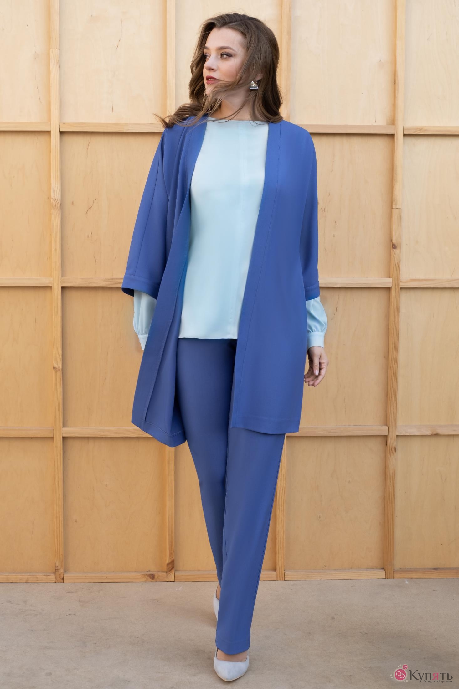 Прекрасный вариант выглядеть элегантно и женственно! Такой базовый комплект – настоящая палочка-выручалочка для любой ситуации, будь то будни в офисе или праздничный ужин. Костюм женский тройка, состоит из блузки прямого силуэта, кардигана также прямого силуэта и брюк. Костюм предназначен для повседневной носки. Кардиган женский прямого силуэта без застежки с цельнокроенным рукавом длиной 3/4. Низ рукава обработан притачной манжетой. Борта и горловина кардигана обработаны планкой. Спинка кардигана со средним швом. Блузка женская прямого силуэта с асимметричной линией низа, перед длиннее спинки. По низу боковых швов обработаны разрезы. Перед блузки со средним швом и нагрудными вытачками, которые выходят из бокового шва. Спинка блузки с встречной складки стачаной от горловины. Горловина овальной формы обработана бейкой. Рукава втачные одношовные длинные. Низ рукава обработан притачной манжетой, которая застегивается на петлю и пуговицу. По шву притачивания рукава к манжете имеется сборка. Брюки женские со “стрелками”. В боковых швах обработаны карманы с наклонной линией входа. Верхний край брюк обработан поясом-обтачкой. Брюки застегиваются спереди на тесьму-молнию и петлю и пуговицу на поясе обтачке. Тип ткани на кардиган и брюки: костюмно-плательная.