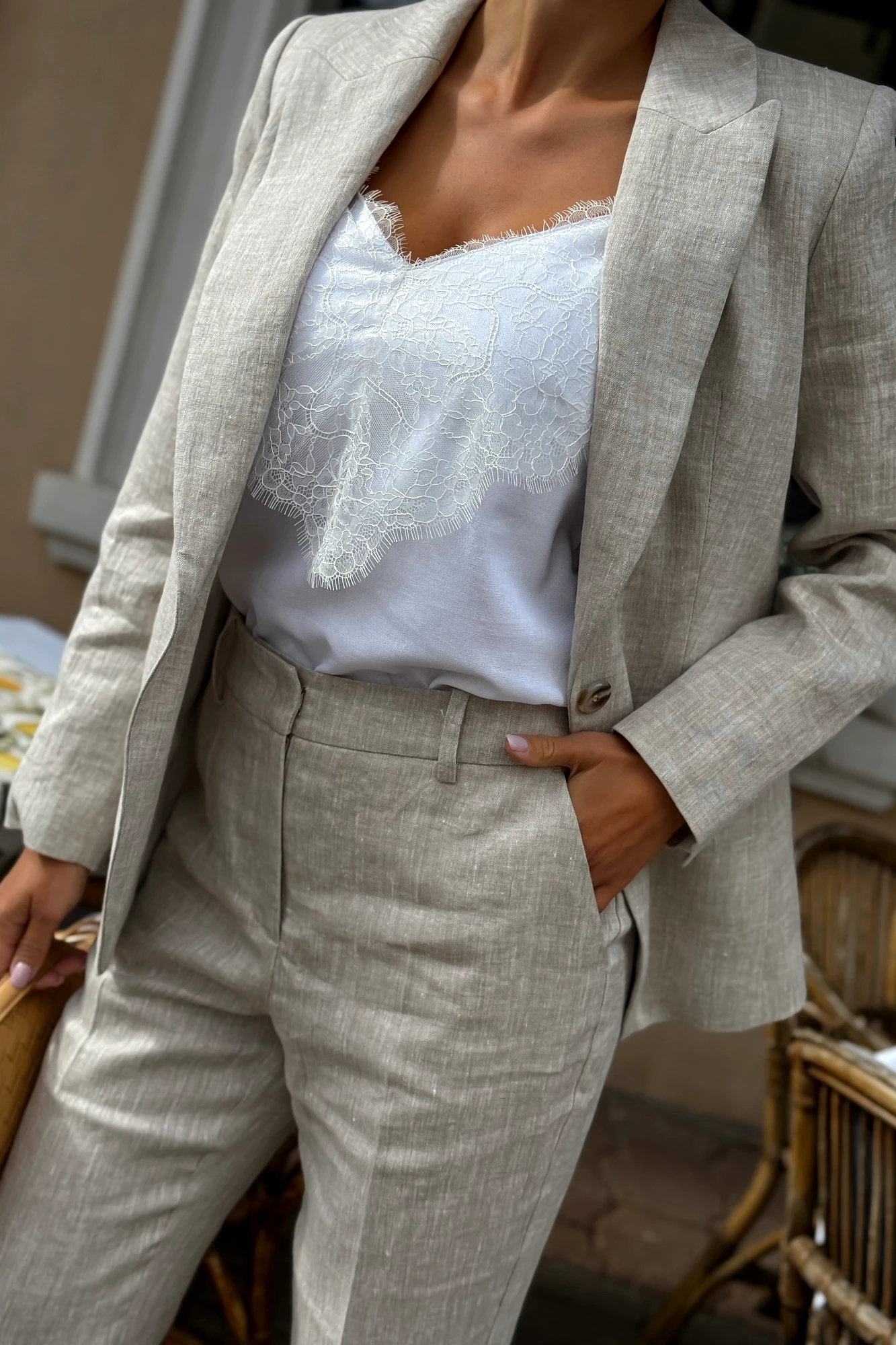 Жакет Длина жакета по среднему шву спинки –66,0 см (±2,0 см), Ширина жакета на уровне глубины проймы – 52,0 см (±1,0 см), Ширина на уровне линии талии – 51,0см (±1,0 см), Ширина на уровне линии бедра – 56,0см (±1,0 см), Длина рукава – 61,0см (±1,0 см), Ширина рукава вверху – 18,5 см (±1,0 см), Ширина рукава внизу - 12,5 см (±0,5 см), Длина плеча – 12,0 см (±0,5 см). Брюки Длина брюк по боковому шву с поясом – 104,0см (±2,0 см), Ширина пояса - 4,5см (±0,5 см), Ширина брюк на уровне линии талии – 39,0см (±1,0 см), Ширина брюк на уровне линии бедер – 52,0см (±1,0 см), Ширина брюк по низу – 18,5см (±0,5 см).