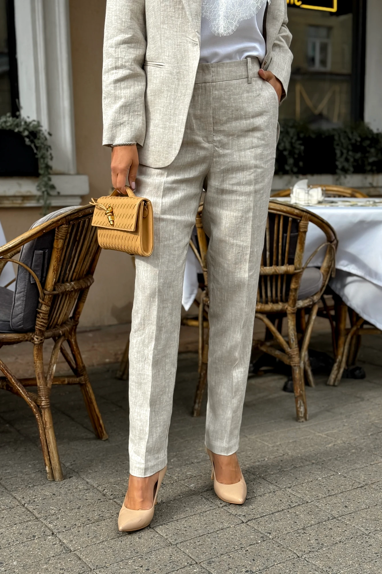 Жакет Длина жакета по среднему шву спинки –66,0 см (±2,0 см), Ширина жакета на уровне глубины проймы – 54,0 см (±1,0 см), Ширина на уровне линии талии – 52,0см (±1,0 см), Ширина на уровне линии бедра – 58,0см (±1,0 см), Длина рукава – 61,0см (±1,0 см), Ширина рукава вверху – 19,5 см (±1,0 см), Ширина рукава внизу - 12,5 см (±0,5 см), Длина плеча – 12,0 см (±0,5 см). Брюки Длина брюк по боковому шву с поясом – 104,0см (±2,0 см), Ширина пояса - 4,5см (±0,5 см), Ширина брюк на уровне линии талии – 41,0см (±1,0 см), Ширина брюк на уровне линии бедер – 54,0см (±1,0 см), Ширина брюк по низу – 18,5см (±0,5 см).