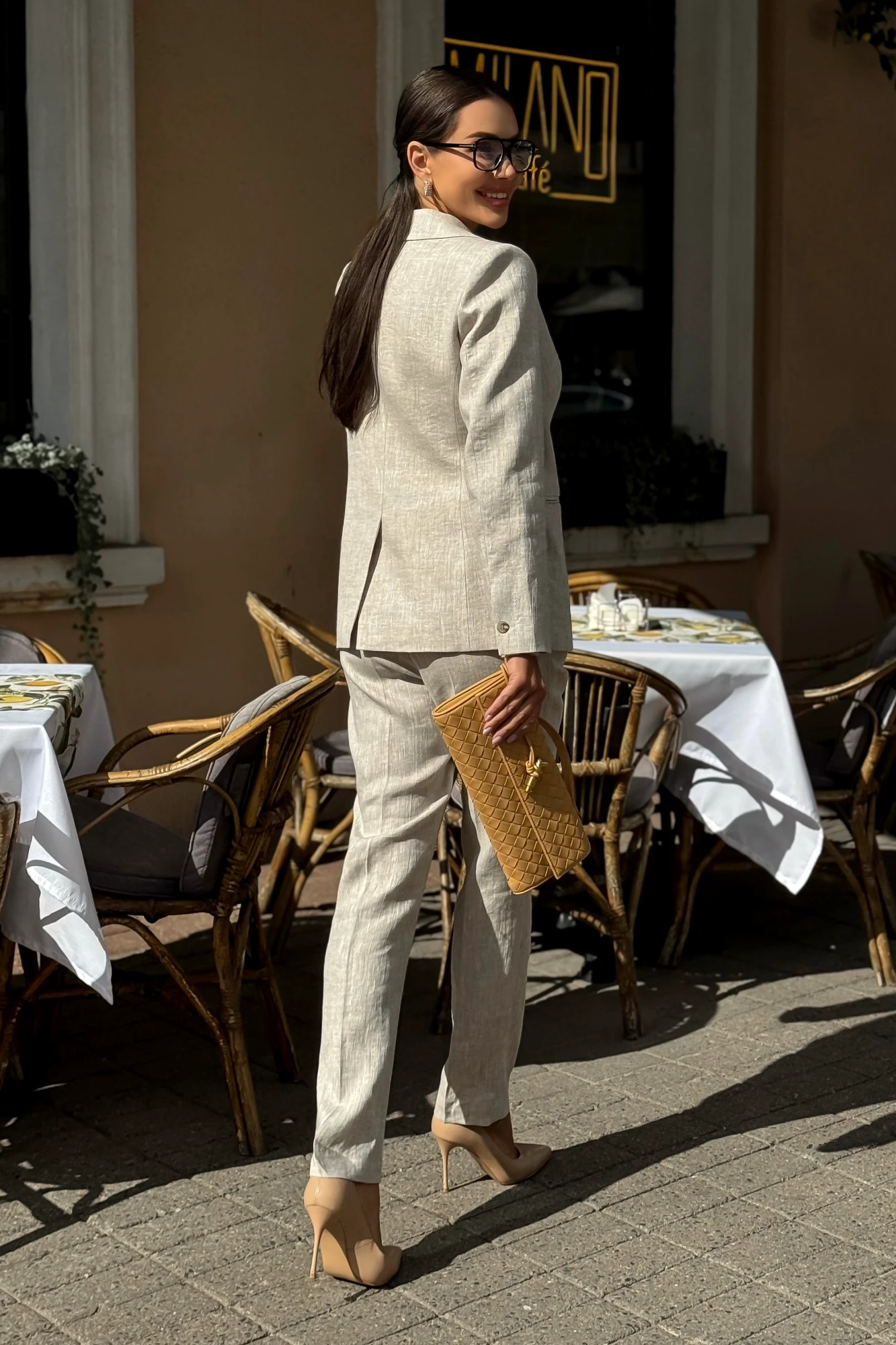Жакет Длина жакета по среднему шву спинки –66,0 см (±2,0 см), Ширина жакета на уровне глубины проймы – 48,0 см (±1,0 см), Ширина на уровне линии талии – 46,5см (±1,0 см), Ширина на уровне линии бедра – 50,5 см (±1,0 см), Длина рукава – 61,0 см (±1,0 см), Ширина рукава вверху – 16,5 см (±1,0 см), Ширина рукава внизу - 12,0 см (±0,5 см), Длина плеча – 11,5 см (±0,5 см). Брюки Длина брюк по боковому шву с поясом – 101,5см (±2,0 см), Ширина пояса - 4,5см (±0,5 см), Ширина брюк на уровне линии талии – 35,0см (±1,0 см), Ширина брюк на уровне линии бедер – 47,0см (±1,0 см), Ширина брюк по низу – 17,5см (±0,5 см).