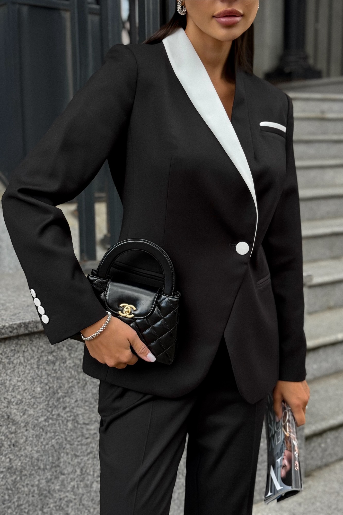 Жакет Длина по среднему шву спинки - 65,5 см (±2,0 см), Ширина спинки (между швами втачивания рукавов, в замом узком месте) - 37,0 см (±0,5 см), Ширина на уровне глубины проймы - 47,0 см (±1,0 см), Ширина на уровне линии талии - 41,0 см (±1,0 см), Ширина по низу жакета - 51,5 см (±1,0 см), Длина рукава - 61,0 см (±1,0 см), Ширина рукава вверху - 16,0 см (±0,5 см), Ширина рукава по низу - 12,7 см , Длина плеча - 11,8 см (±0,5 см). Брюки Длина по боковому шву с поясом - 110,5 см (±2,0 см), Длина внутреннего шва - 83,5 см (±1,0 см), Ширина на уровне линии талии - 34,0 см (±1,0 см), Ширина на уровне линии бедер - 44,5 см (±1,0 см), Ширина брюк по низу - 25,5 см (±0,5 см), Ширина пояса - 4,5 см.