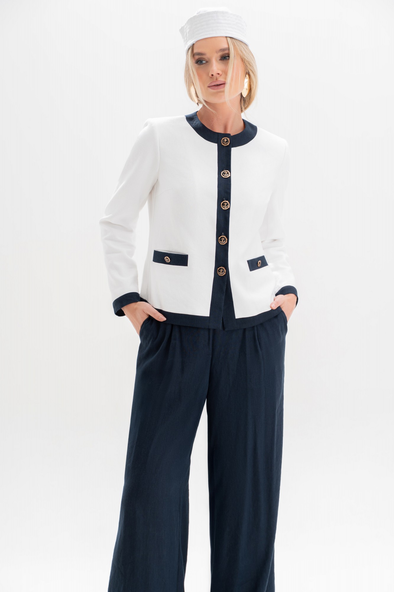 Костюм женский 2-х предметный, состоящий из жакета и брюк, выполненных из костюмно-плательной ткани лен, для повседневной носки. Жакет женский, свободного полуприлегающего силуэта, выполнен из молочного льна, на подкладке, с центральной бортовой застежкой до верха с притачными планками, на 5 петель и 5 пуговиц (размер и цвет фурнитуры может незначительно отличаться от фото). Перед с нагрудными вытачками, идущими от боковых швов, в нижних частях с прорезными карманами с листочками с пришивными пуговицами. Спинка со средним швом, с рельефными швами. Рукава втачные, двухшовные, длинные, с притачными манжетами. Горловина круглая, обтачная. Низа переда и спинки, горловина переда и спинки, оформлены притачными планками, выполненными из темно-синего льна. Притачные планки застежки переда, листочки карманов, манжеты рукавов также выполнены из темно-синего льна. Жакет с плечевыми накладками. Брюки женские, выполнены из темно-синего льна, в размерах 44,46,48,50 прямые от бедра, на обтачном поясе, с 5-ю шлевками, с застежкой на тесьму - «молнию», расположенную в среднем шве передних половинок. Пояс застегивается спереди на 1 пришивной потайной крючок, 1 петлю и 1 потайную пуговицу. Передние половинки брюк, с односторонними складками, с боковыми наклонными карманами. Складки и карманы частично застрочены от пояса вниз. Задние половинки брюк с двумя парами таллиевых вытачек. Брюки без заутюженных стрелок. Брюки женские, выполнены из темно-синего льна, в размерах 52,54,56,58 прямые от бедра, с притачным поясом, с резинками на уровне боковых швов, с 5-ю шлевками, с застежкой на тесьму - «молнию», расположенную в среднем шве передних половинок. Пояс застегивается спереди на 1 пришивной потайной крючок, 1 петлю и 1 потайную пуговицу. Передние половинки брюк, с односторонними складками, с боковыми наклонными карманами. Складки и карманы частично застрочены от пояса вниз. Задние половинки брюк с двумя парами таллиевых вытачек. Брюки без заутюженных стрелок.