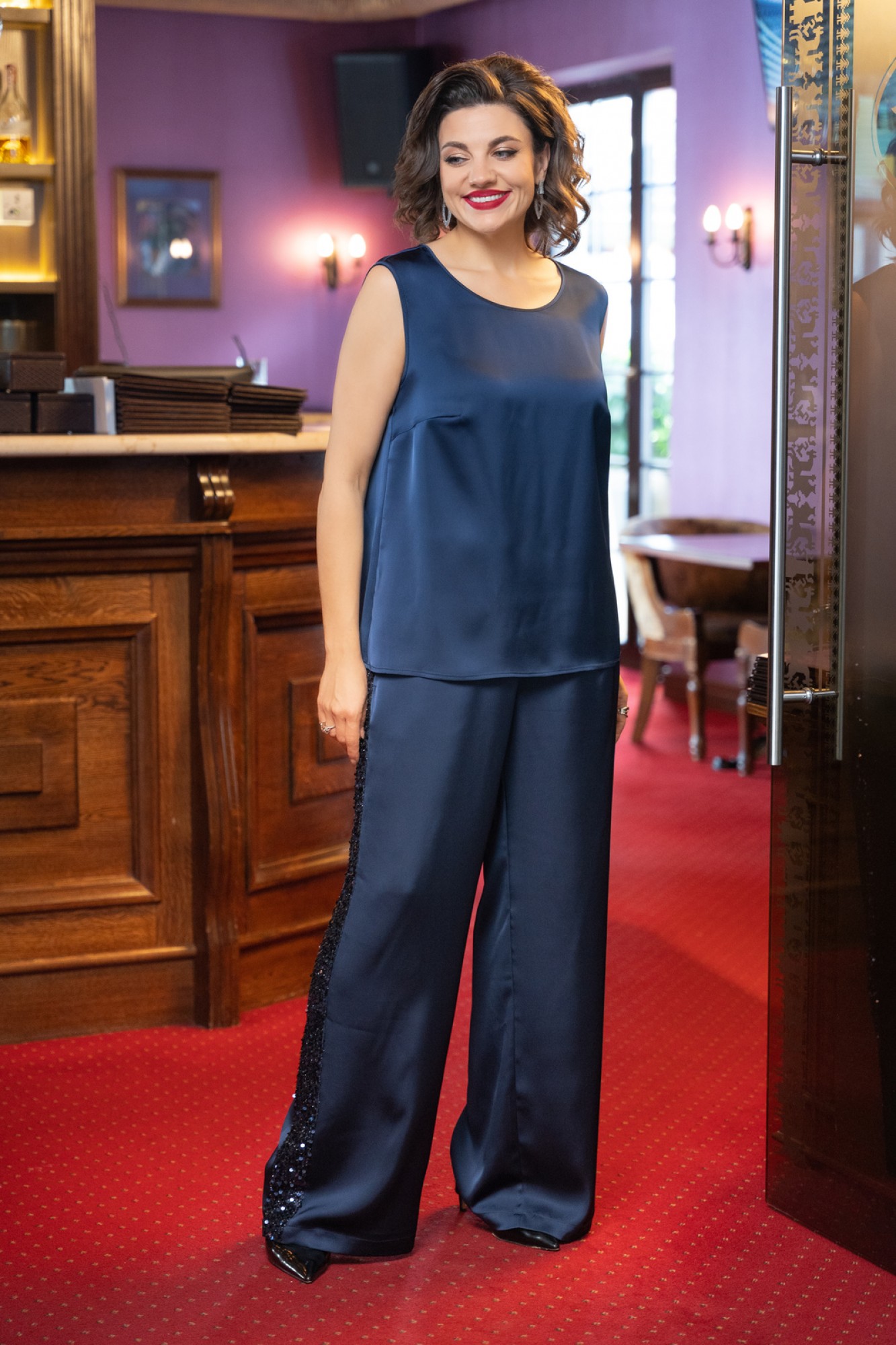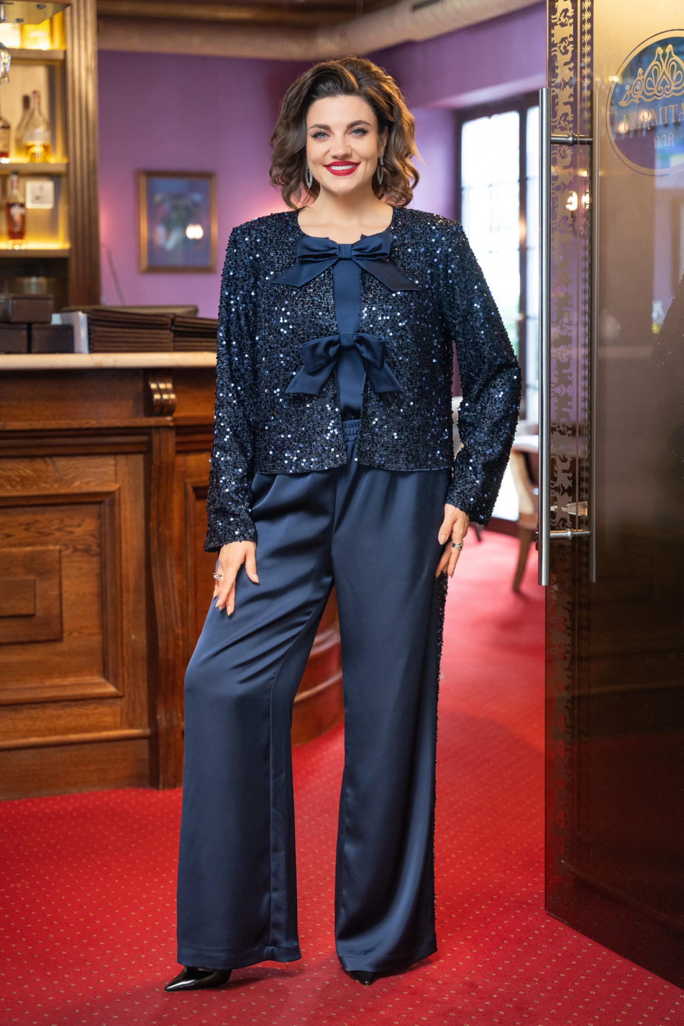 Комплект женский состоит из жакета, топа и брюк. Жакет прямого силуэта свободного покроя с естественной линией плеча на подкладке из атласной ткани. Горловина округлой формы. БАНТЫ СЪЁМНЫЕ! Застежка на съемные декоративные авторские банты с применением потайного крепления на небольшие кнопки, для возможности создания различных образов, как с бантами, так и без них. Топ свободного покроя. Горловина округлой формы. Проймы и горловина окантованы. Брюки свободные расширенного силуэта. По бокам выполнены лампасы из полотна с пайетками. Пояс притачной на резинке. В боковых швах карманы.