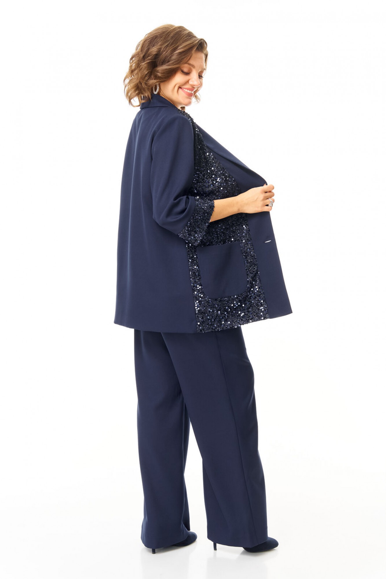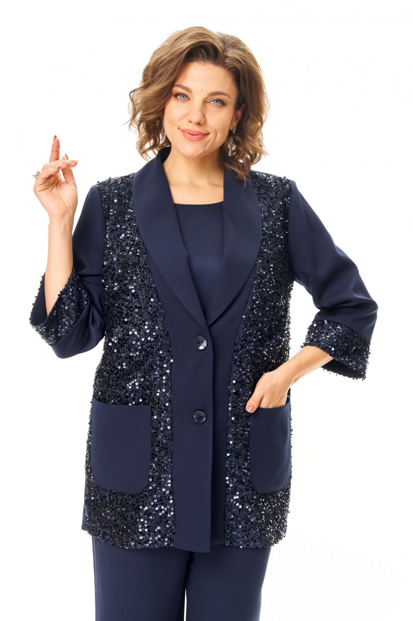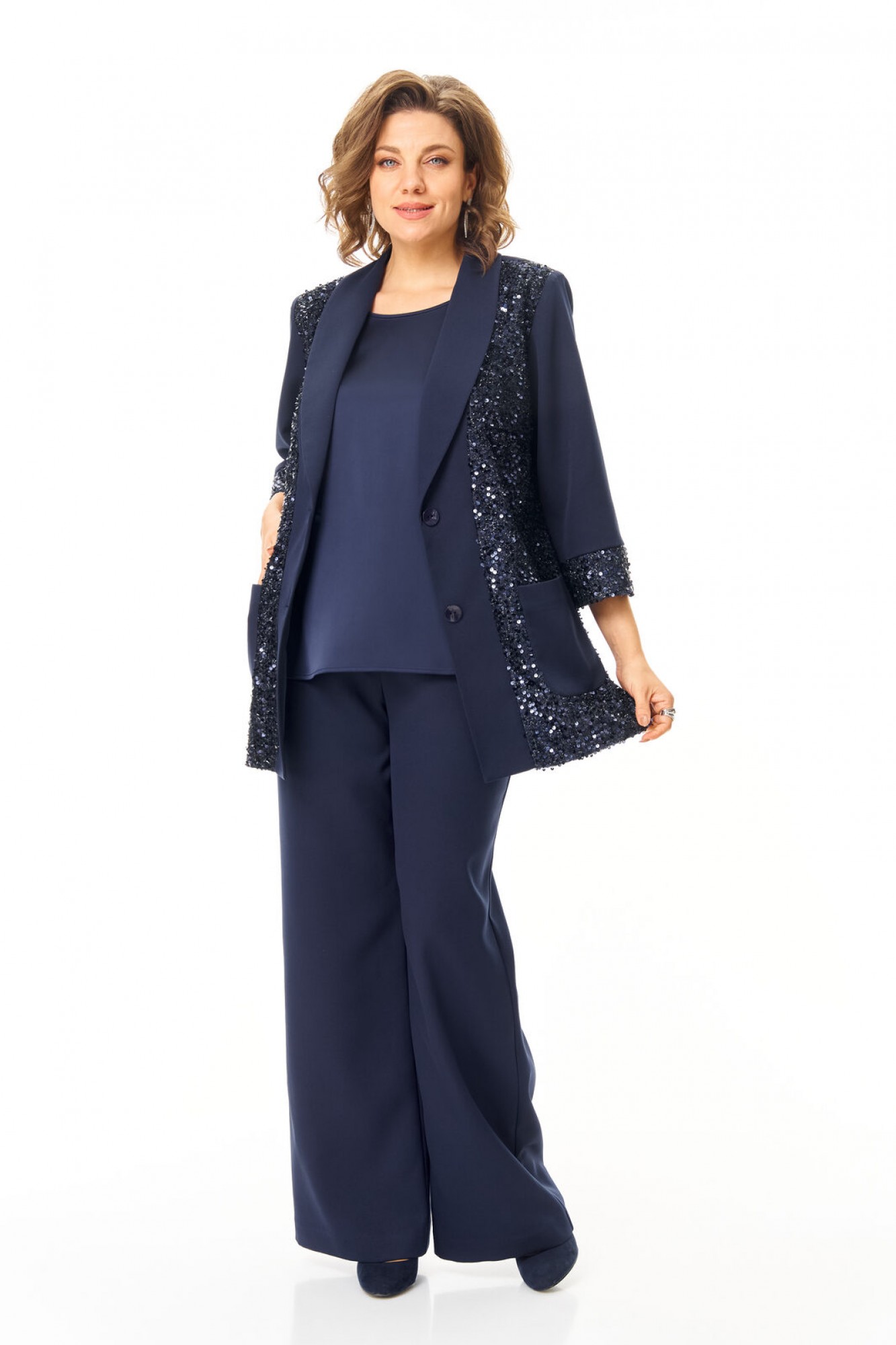 Комплект женский состоит из жакета, топа и брюк. Жакет свободного покроя с естественной линией плеча. Рукав втачной одношовный длиной 3/4 с манжетой из отделочной ткани "пайетки". Перед выполнен из отделочной ткани "пайетки" на атласной подкладке. Обработаны отрезные планки. Застежка центрально-бортовая на петли пуговицы. Воротник отложной типа "шаль". На переде выполнены накладные карманы. Топ свободного покроя из атласной ткани. Горловина округлой формы. Брюки расширенные к низу типа "палаццо" с центральной застёжкой на молнию и петлю-пуговицу. В боковых швах карманы с отрезным бочком. Пояс притачной с резинкой по задней части пояса. В комплект входит съёмный пояс.