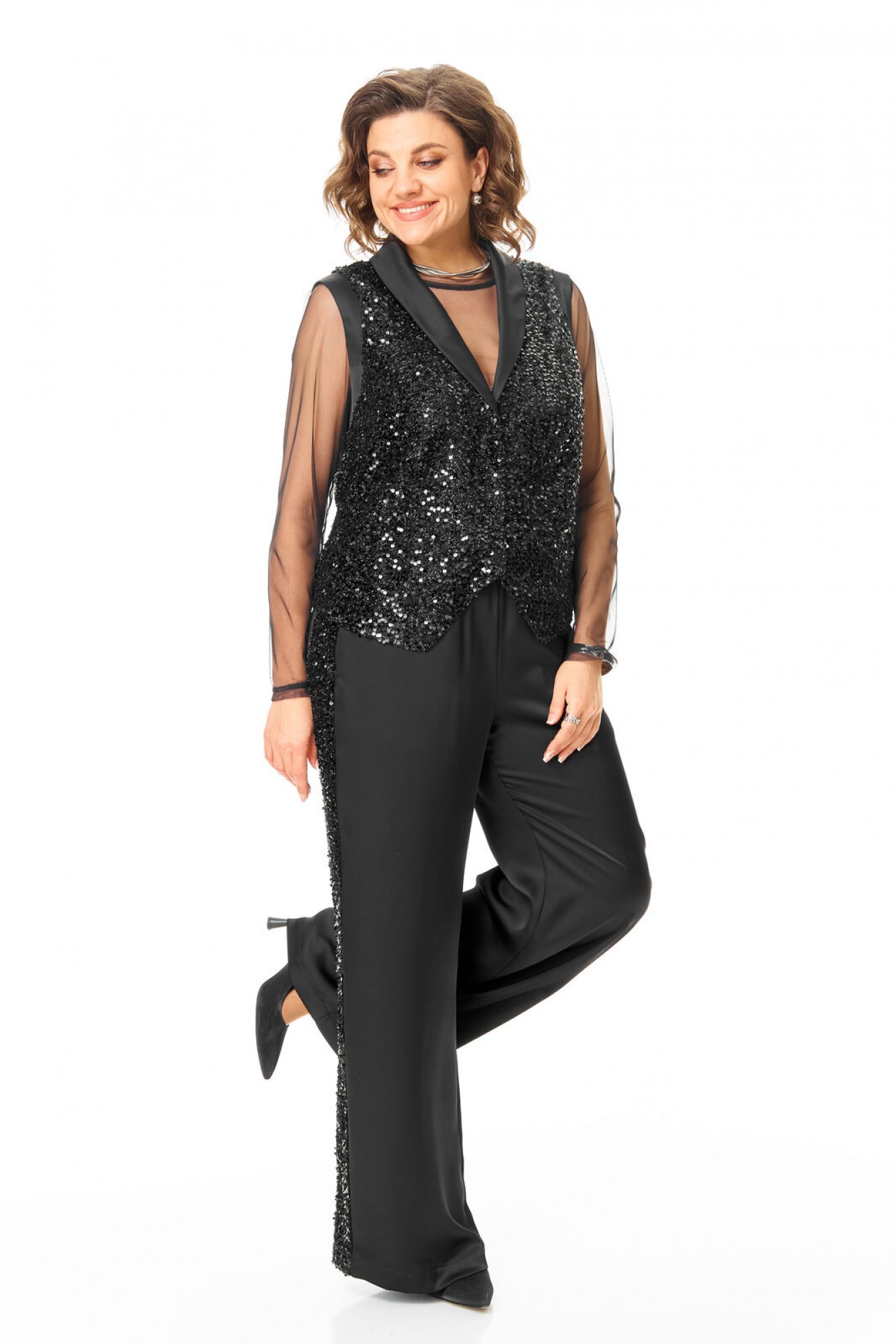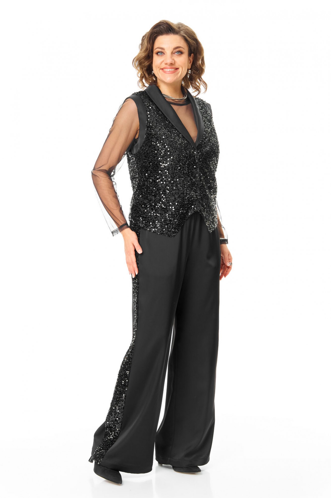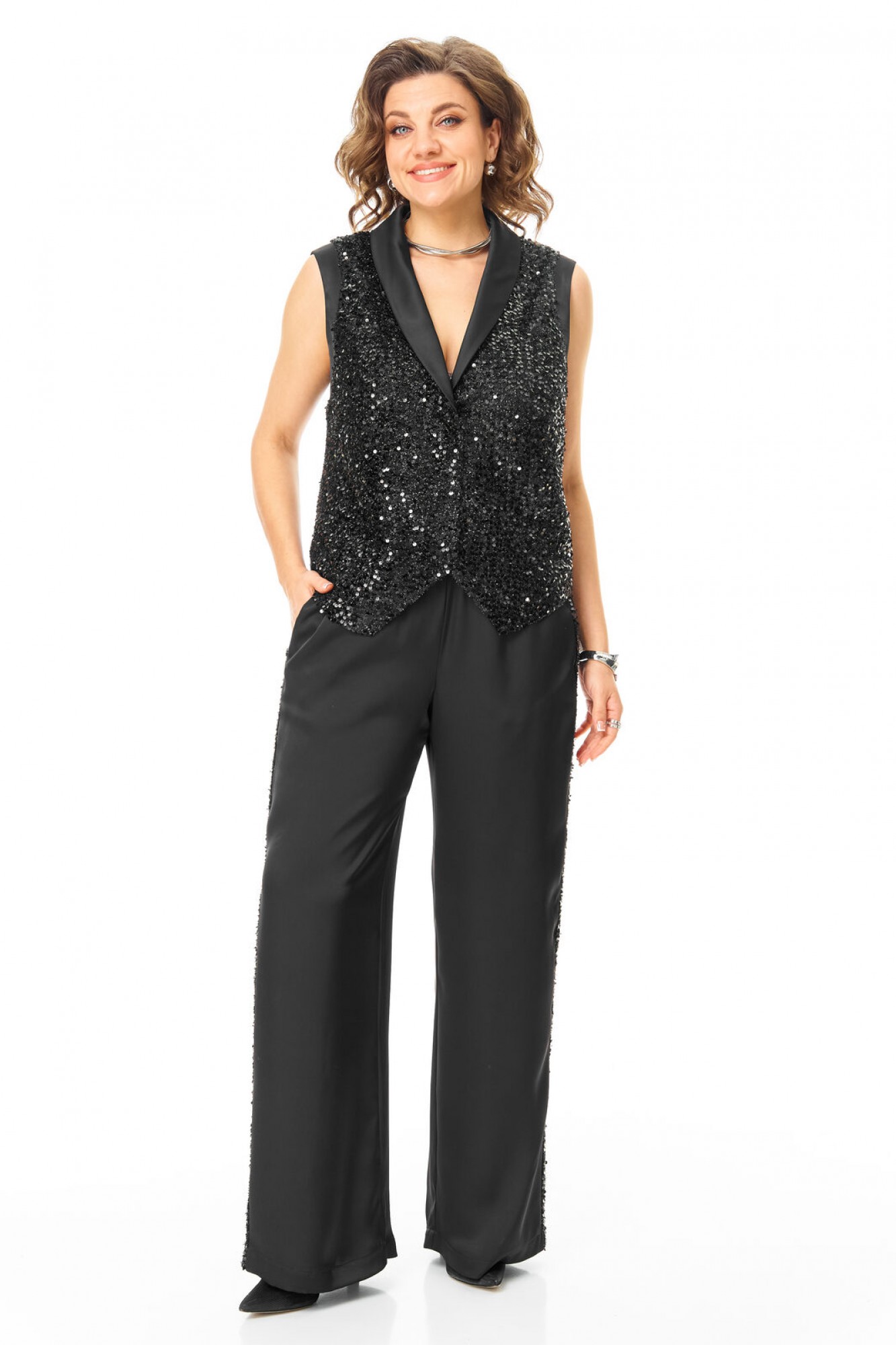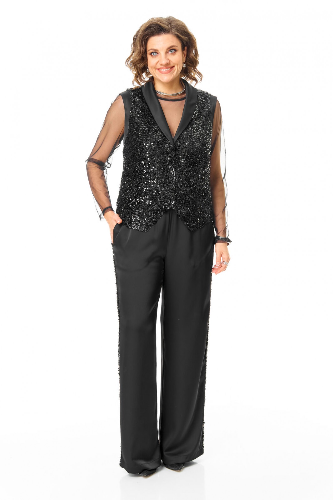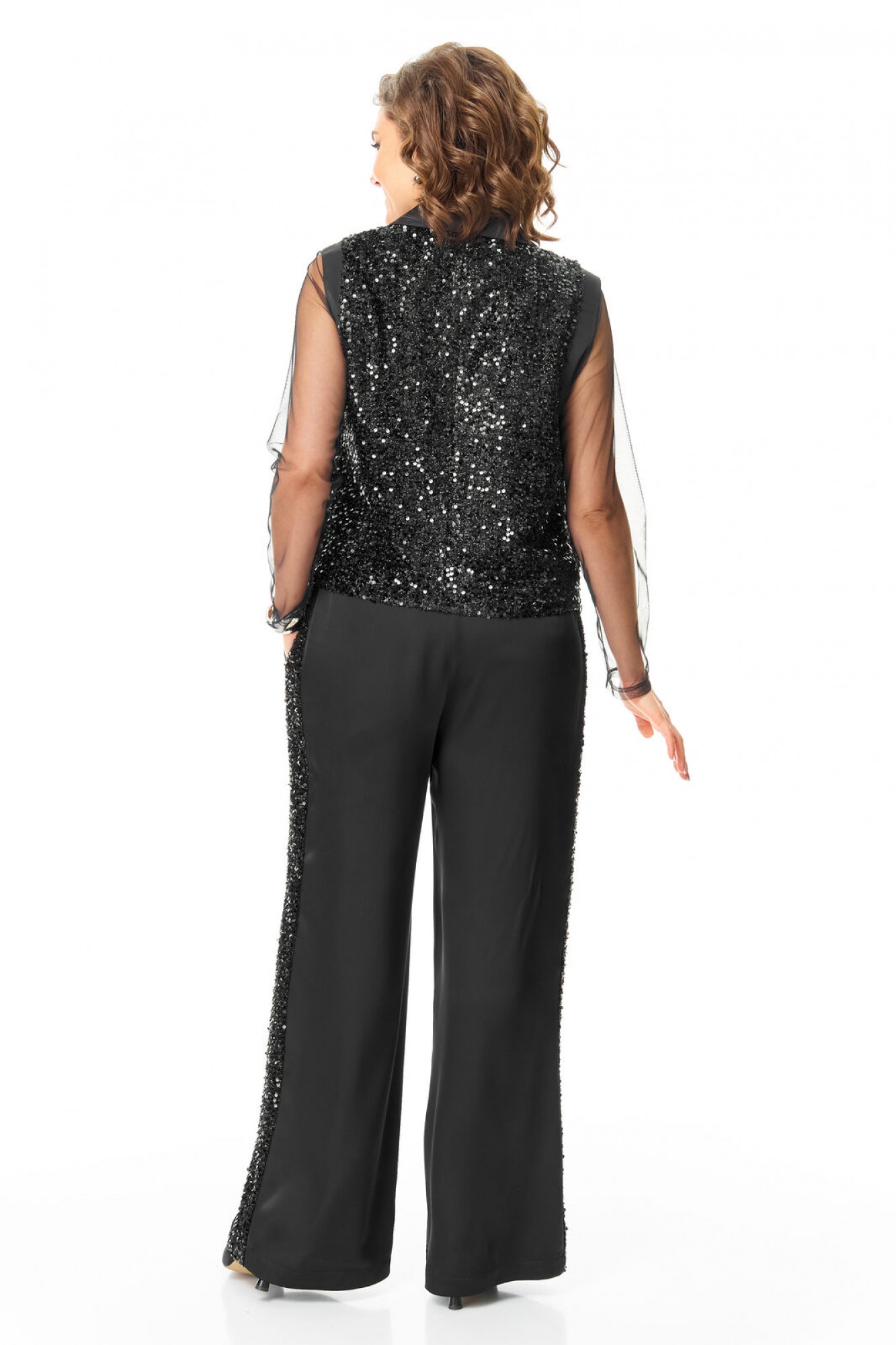Комплект женский состоит из жилета, топа и брюк. Жилет полуприлегающего покроя на подкладке из шелковой атласной ткани. Перед и спинка выполнены из полотна с пайетками. По проймам выполнены бейки из атласной ткани. Низ жилета фигурной формы. Застёжка однобортная на потайные кнопки. Воротник отложной типа "шаль" из атласной ткани. Топ свободного покроя из полотна сетка. Горловина округлой формы, окантована. Рукав длинный. Брюки свободные расширенного силуэта. По бокам выполнены лампасы из полотна с пайетками. Пояс притачной на резинке. В боковых швах карманы.
