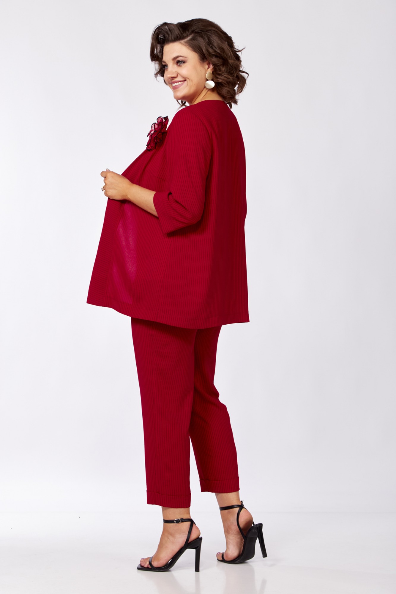 Комплект женский состоит из жакета, топа и брюк. Жакет свободного покроя с естественной линией плеча. Рукав втачной одношовный длиной 3/4 с манжетой. По переду обработаны отрезные планки. Имеется съемная брошь в виде цветка. Топ свободного покроя. Горловина округлой формы. По переду обработана кокетка из основной ткани комплекта. Рукав спущенный цельнокроеный. Брюки зауженные к низу, с центральной застёжкой на молнию и петлю-пуговицу. Низ брюк с отложной манжетой. В боковых швах карманы. Пояс притачной с резинкой по бокам.