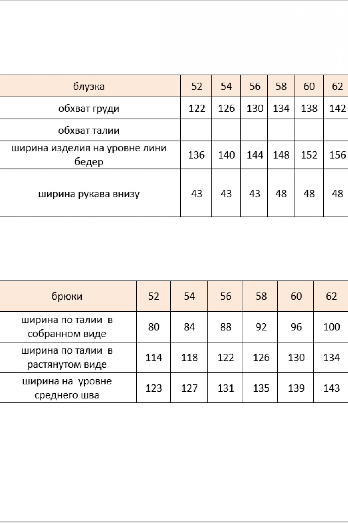 Длина блузы по центру спинки 72 см, длина рукава 30,5 см(р.52-56), 33 см (р.58-62). Длина брюк по боковому шву от шва притачивания пояса 108 см (р.52-56), 108,5 см(р.58-62).