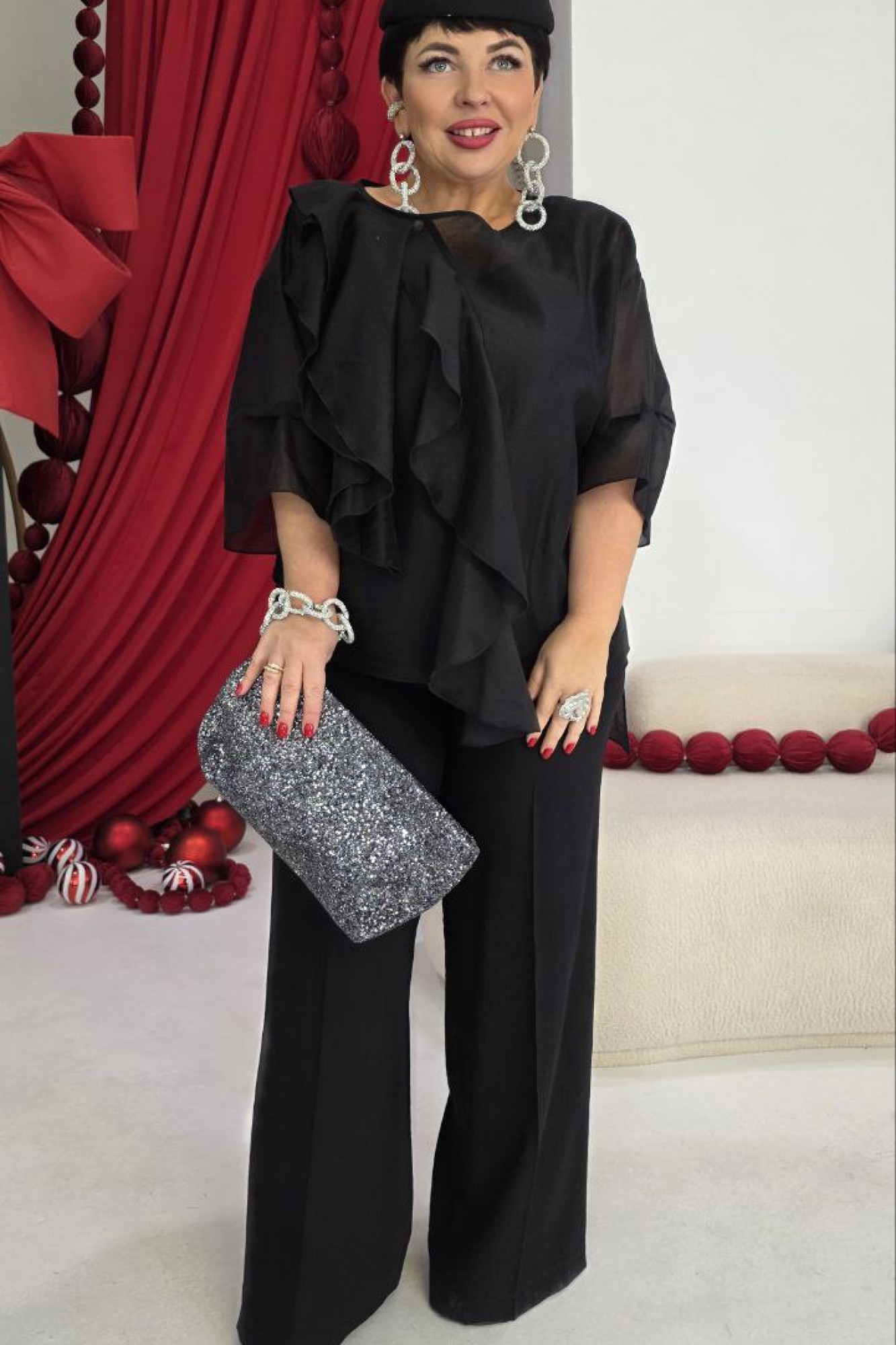 Комплект женский брючный, состоящий из верхней блузы, нижней блузы и брюк. Вуалирующая прозрачность блузы, скрывает несовершенства фигуры, и создает идеальный силуэт, а брюки из ткани с «жатой» фактурой стройнят и вытягивают силуэт. Верхняя блуза свободного силуэта с округлой формой горловины. Линия плеча спущенная. Рукав втачной, длинной ¾ с декоративным защипом. Спинка без особенностей. Низ в блузе ассиметричный с разрезами в боковых швах. Главным акцентом блузы являются отделочные вставки в подрезе в виде рюш. Нижняя блуза свободного силуэта, с округлой формой горловины, нагрудными вытачками по переду блузы. Спинка без особенностей. В боковых швах разрезы. Брюки прямого силуэта со стрелками по переду. Пояс в брюках притачной с эластичной тесьмой-резинкой, которая обеспечивает максимально удобную посадку на любой тип фигуры.
