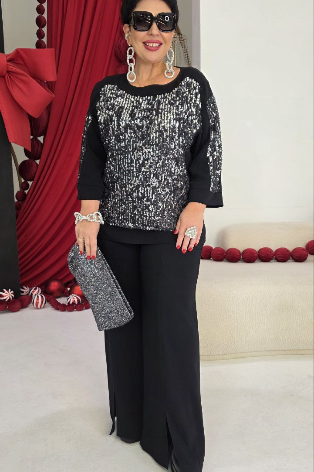 Комплект новогодний женский брючный, состоящий из блузы и брюк. Роскошный женский комплект, состоящий из полупрозрачной блузы с отделкой из ткани в пайетки и брюк - идеальный выбор для праздничного выхода! Блуза свободного силуэта, прямая к низу. Горловина в блузе округлой формы. С настрочной отделочной деталью по переду которая повторяет форму горловины. Спинка блузы без особенностей. Рукав в блузе трехшовный на центральную часть настрачивается отделочная ткань с пайетками по низу манжет. Низ прямой формы. Брюки прямого силуэта с притачным поясом с эластичной тесьмой резинкой, которая обеспечивает максимально удобную посадку на любой тип фигуры. В качестве дополнительного отделочного элемента брюк рельефная линия по переду в разутюжку с отделочными строчками.