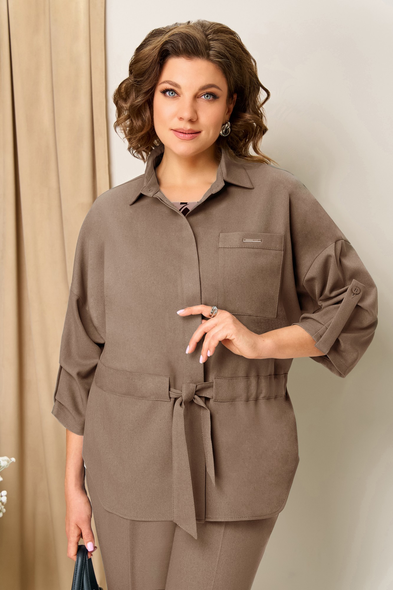 Жакет на потайной застежке, с пришивной кулисой и поясом, прямые классические брюки и блуза- универсальный комплект для различных вариантов носки. Элегантный рукав с патой на цельнокроеной основе. Брюки прямые с высокой посадкой, с притачным поясом на резинке. Блуза из легкого текстиля с принтом, со спущенным коротким рукавом.